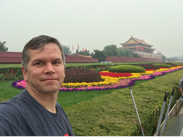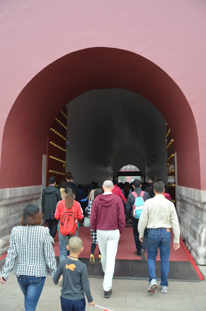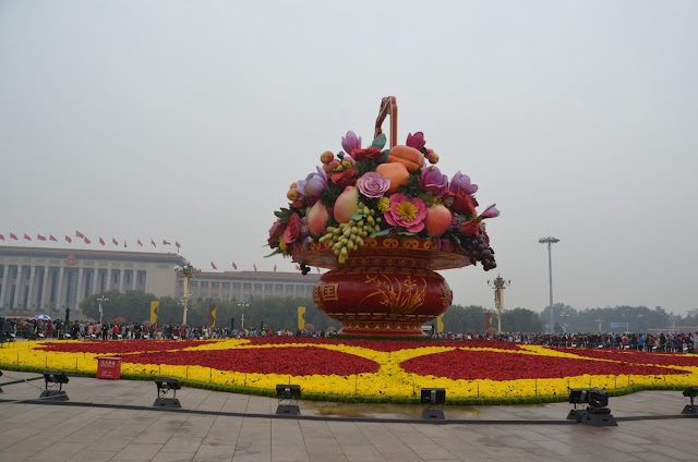 Here is looking back out the entrance, where you can see the huge flower pot at Tiananmen Square (which we visit a little later).