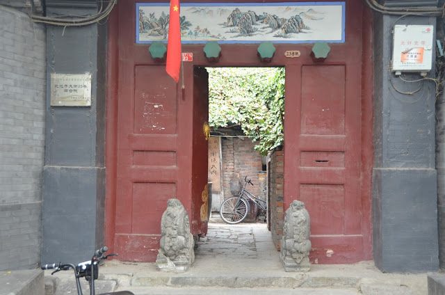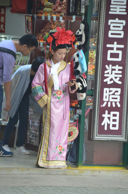 There were some cute traditional scenes as we walked along. I like how this place has the misty Chinese mountain scene, stone dragon guardians, a Chinese flag, and an old bicycle.