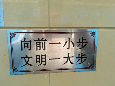 This is a sign in front of a urinal saying, "One small step for man, One giant leap for civilization," or something to that effect (basically asking you to stand close enough not to miss).