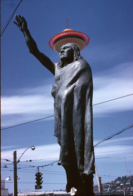 This picture was inspired by my dad's photo of the Space Needle in Seattle, Washington, with help from a Native American statue.