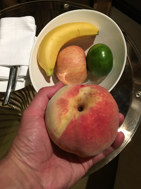 The room came with an offering of fruit as well, including a huge peach that was white in the middle. (Peaches were originally invented in China).