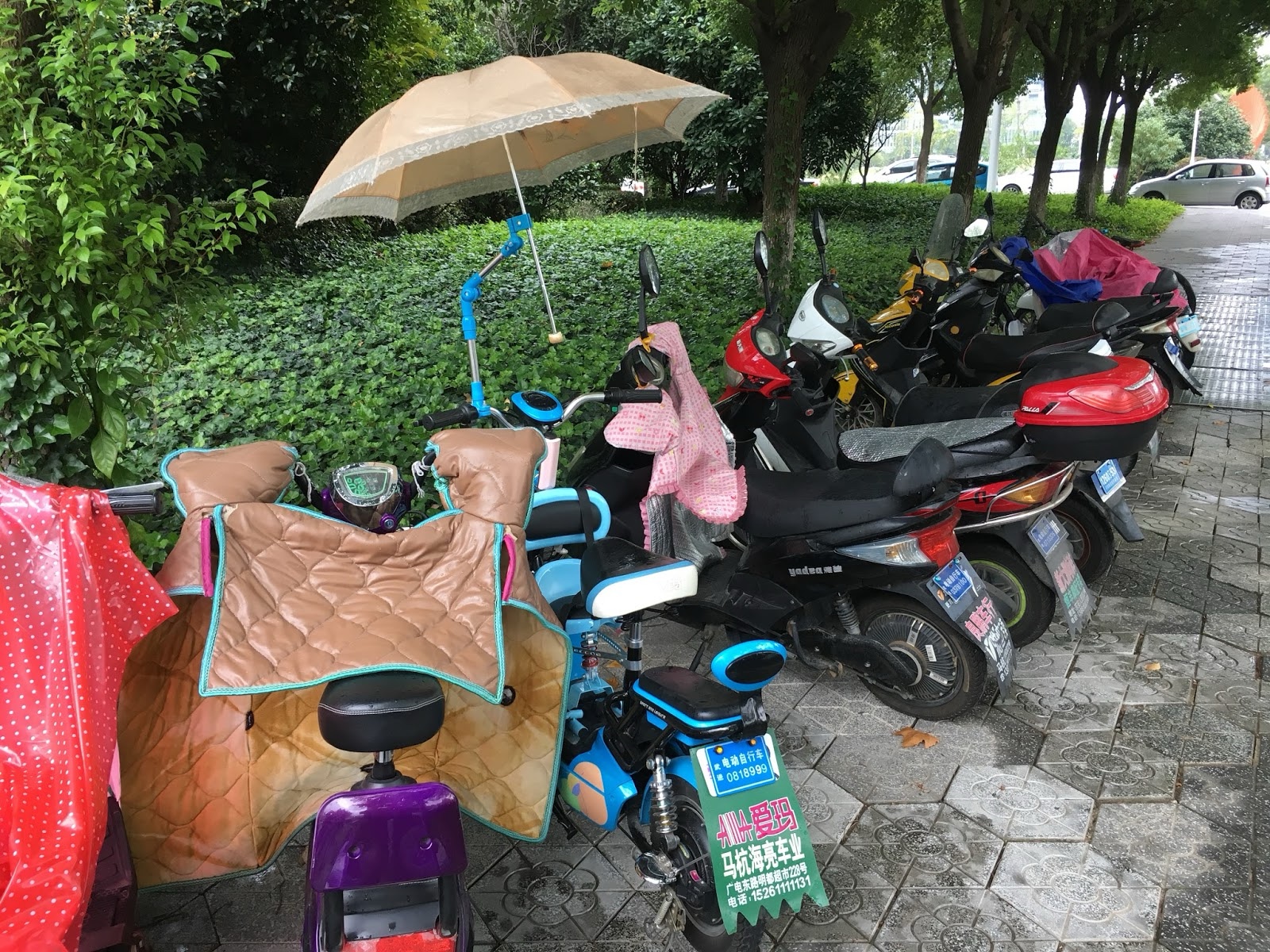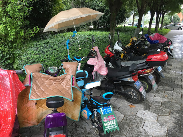 It was a little rainy the next day. There are a whole lot of scooters there, and people have to drive them in the rain, so many people have little "snuggies" that keep them warm and dry while they ride. This person even rigged an umbrella!