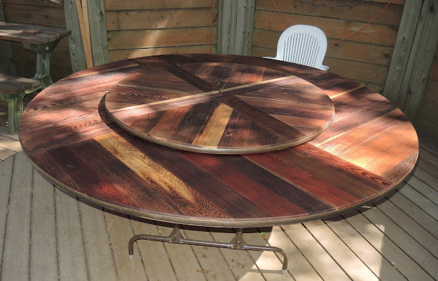 I of course immediately thought of the redwood table my dad had just built from old pieces of redwood decking (planed into beautiful wood for the table). He had included lazy Susan on his, too.