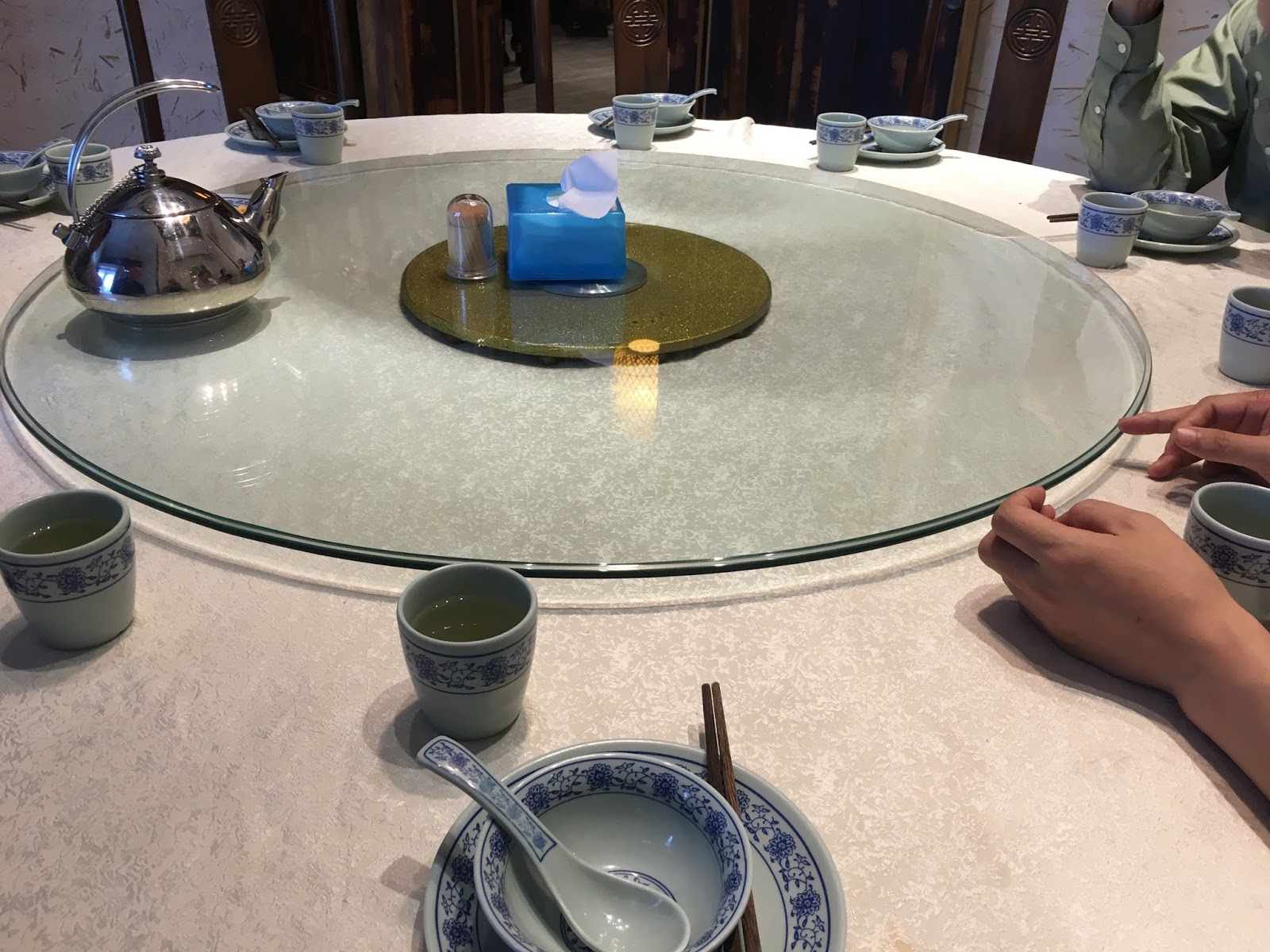 We went to lunch and found that the table had a "lazy Susan" that was used for passing all the dishes around.