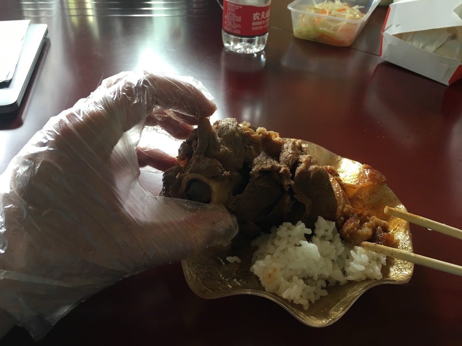 For lunch on Wednesday there were hunks of meat on the bone. They provided plastic gloves to wear while you man-handle the meat. The one part I couldn't deal with is when people started sucking the marrow out of the bones with a straw.