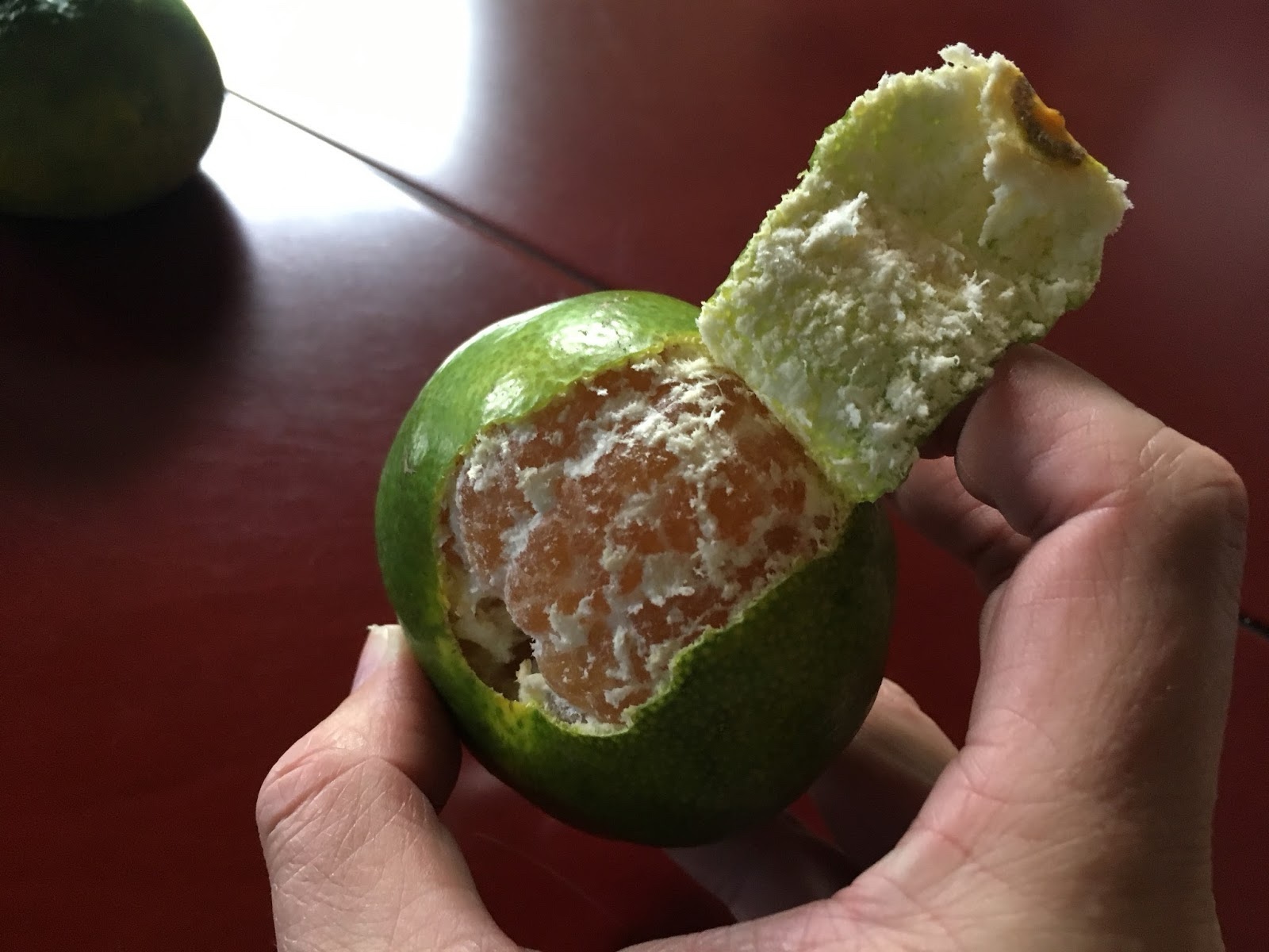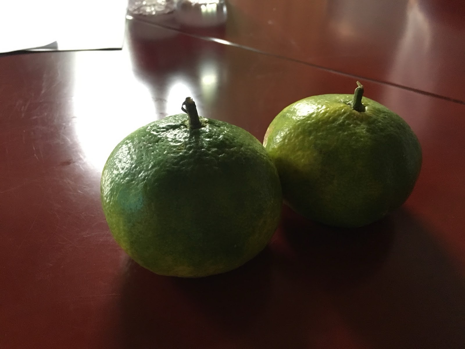 Well, they're not! They're tangerines! They're green on the outside, and orange in the inside.