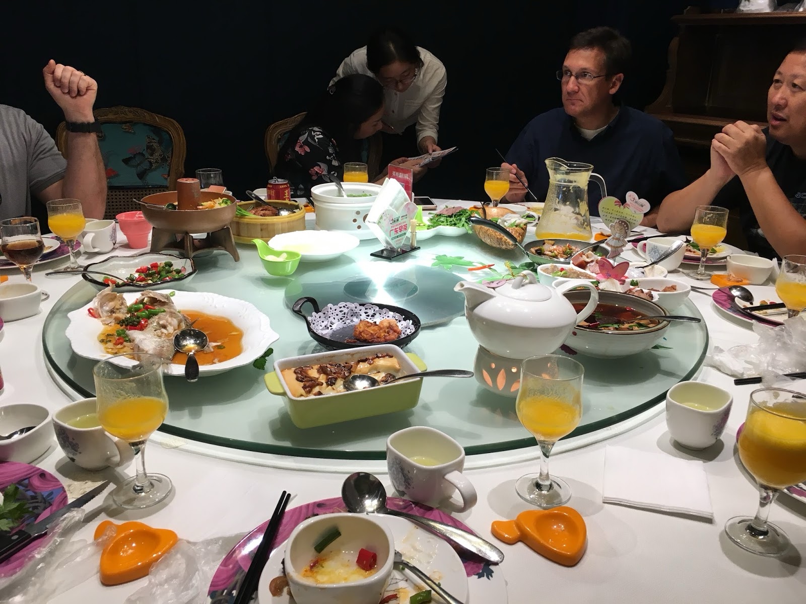 That night, the company took us to an amazing dinner. Again, there were very few dishes I could recognize without asking. There was a sort of tofu flan, a special kind of white fish you can only get in the lake near Changzhou (very good), and all kinds of other things. People kept pushing food on Merlin, who tends to finish eating before everyone else (even in America).
