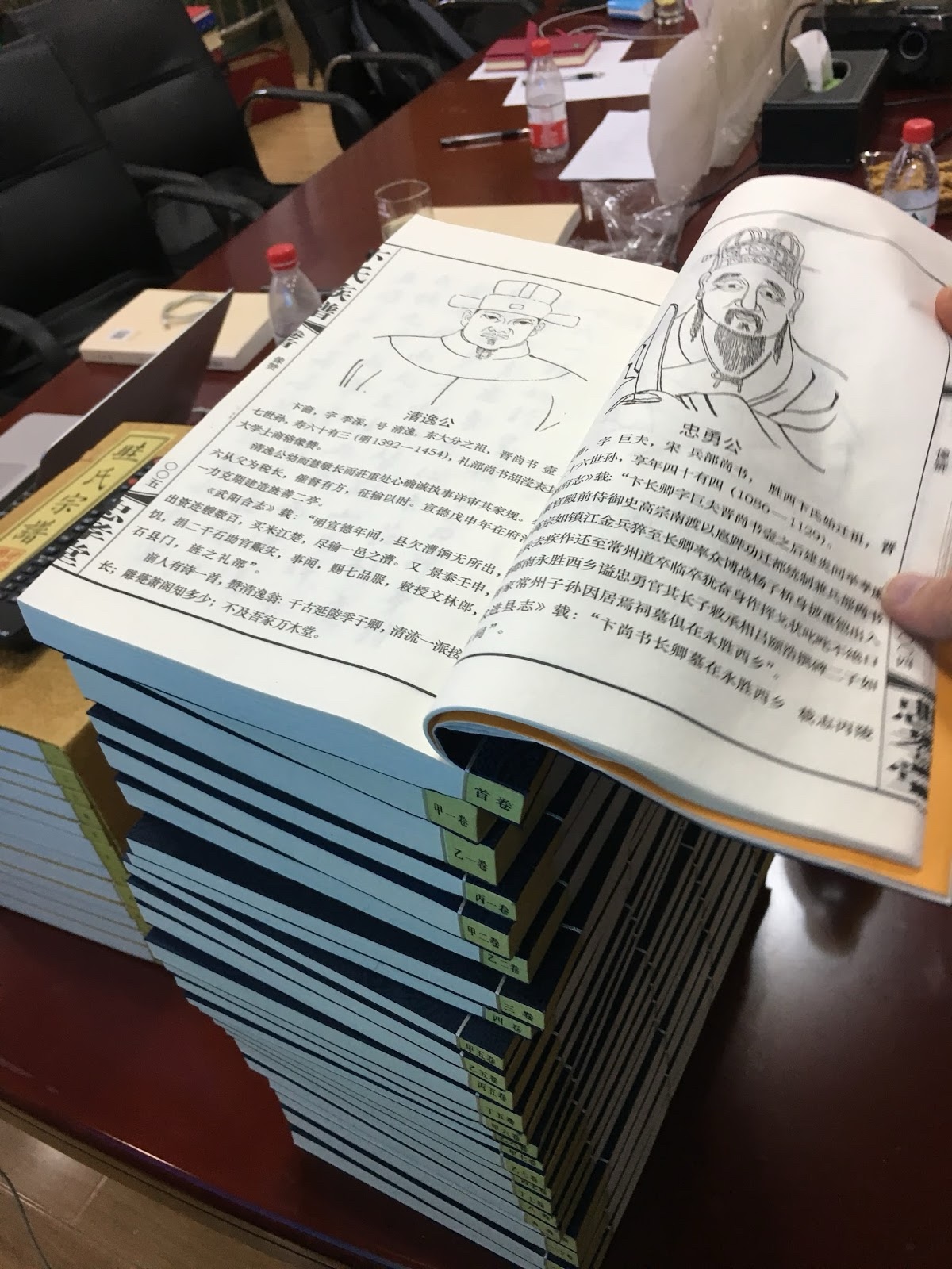 Here's another example of a Jiapu. Books in China are traditionally written top to bottom, right to left, back to front. This whole stack is a set of related people in one big book collection. Some of the pages have sketches of the ancestors.