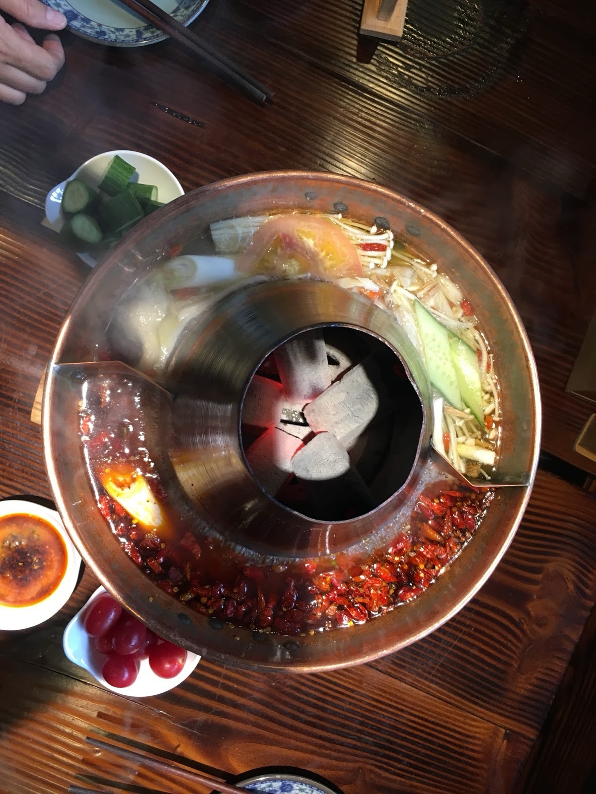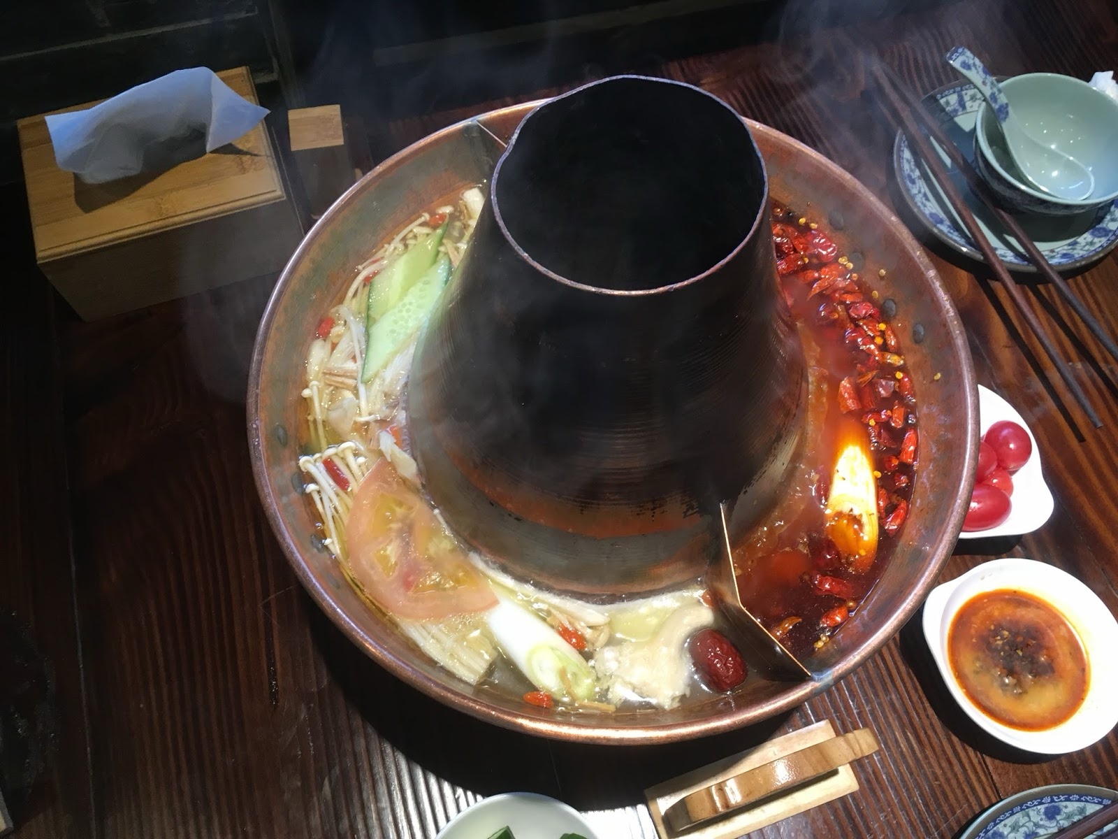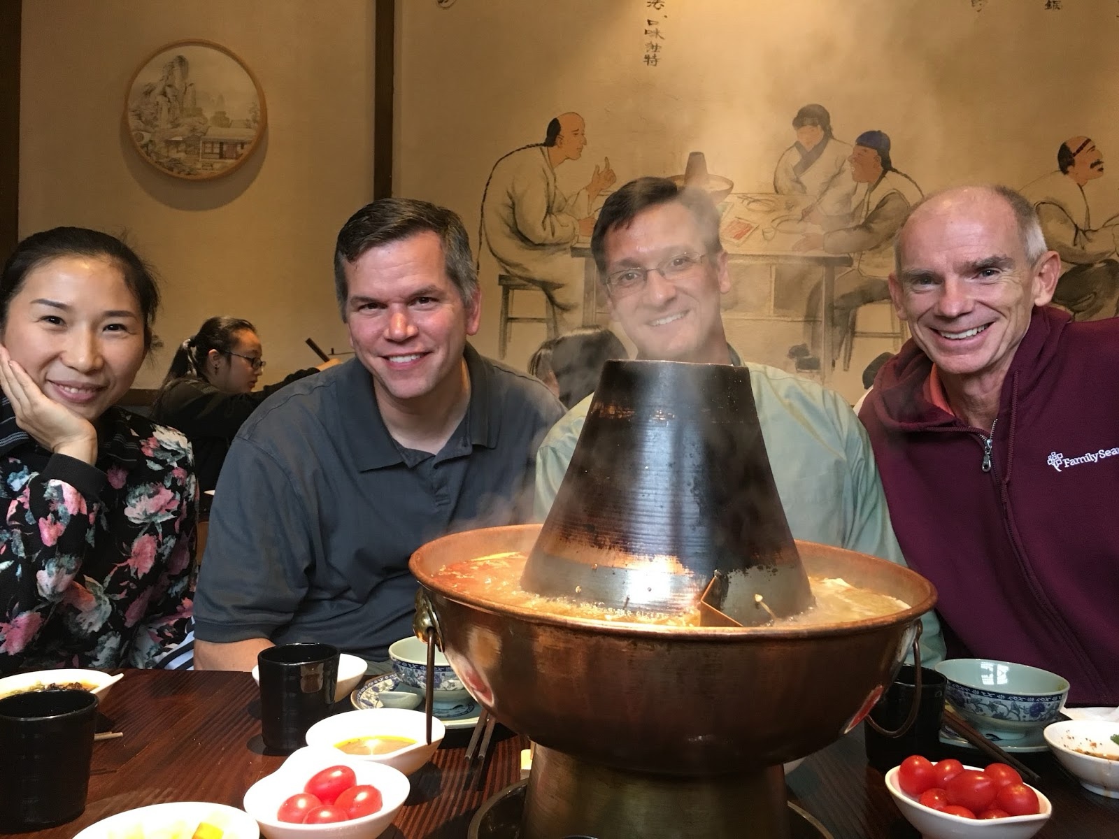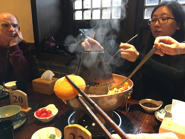 For lunch we had a "hot pot." They bring out this pot with soup boiling in it. There's a spicy half and a mild half. They bring out various kinds of meat, mushrooms, etc., and you drop stuff in and let it cook and then pull it out, dip it in sauces you have chosen, and eat it. We were a little frightened of the "tripe" (cow stomach), but the beef and lamb were good.