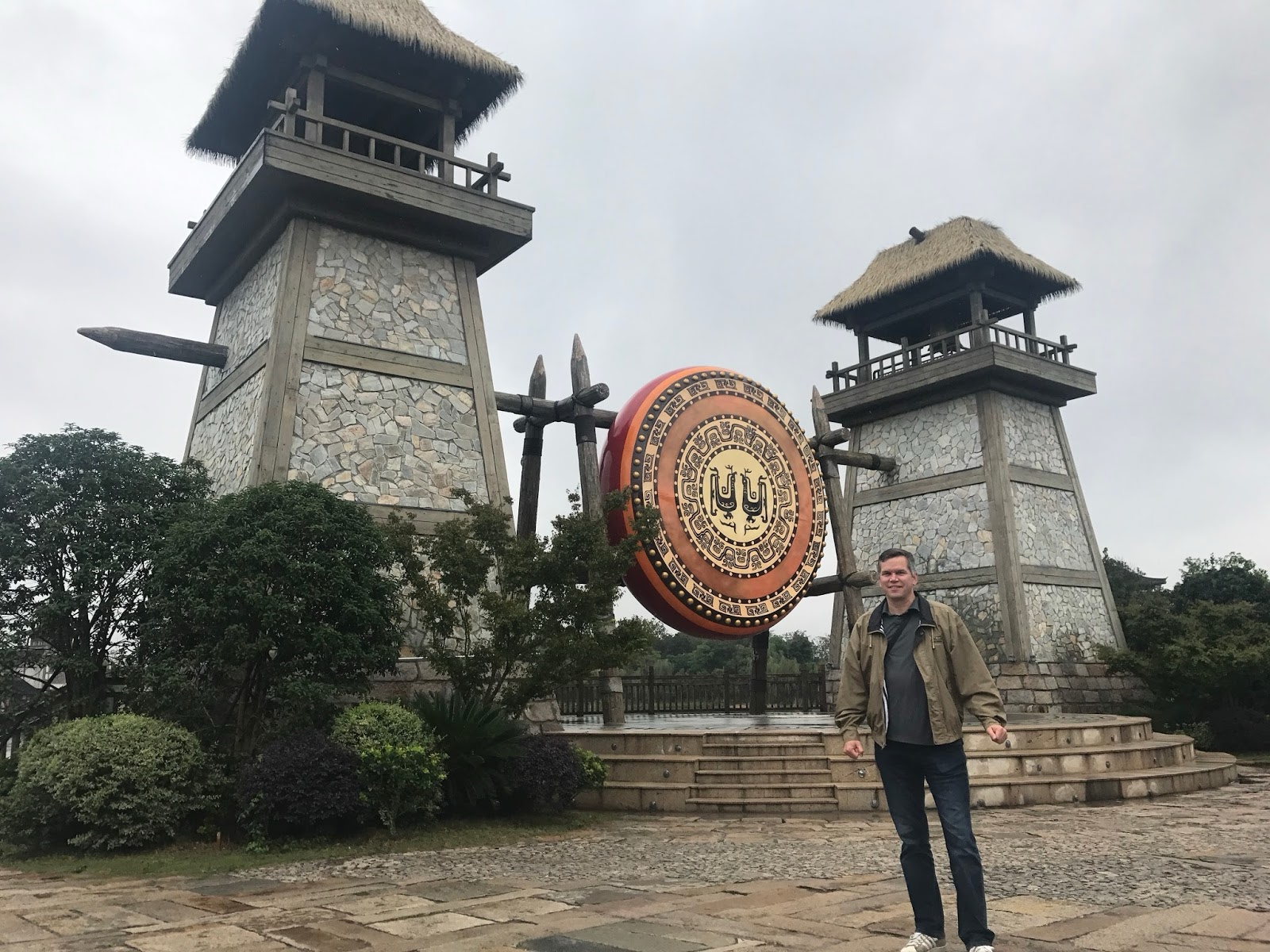 There's a huge drum hung between two towers that each have a huge bell.