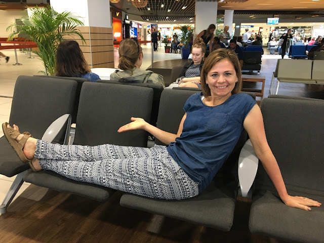 While we waited in the airport, I noticed that Linette was excited about wearing the comfy pants that Erika had sent her from Peru.