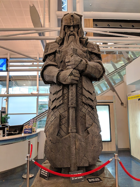 Hobbits first settled in New Zealand in 1999 (at least, that's when The Lord of the Rings was first filmed). Here's a Middle Earth statue at the airport.