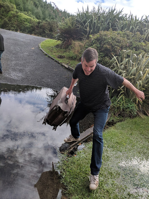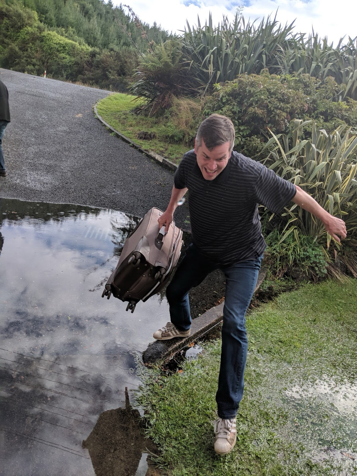 We had rented a house via AirBnB that was right between the lakes of Rotorua and Rotoiti. There was also a small lake on the driveway due to the downpour, so we had to form a chain and pass the luggage across.