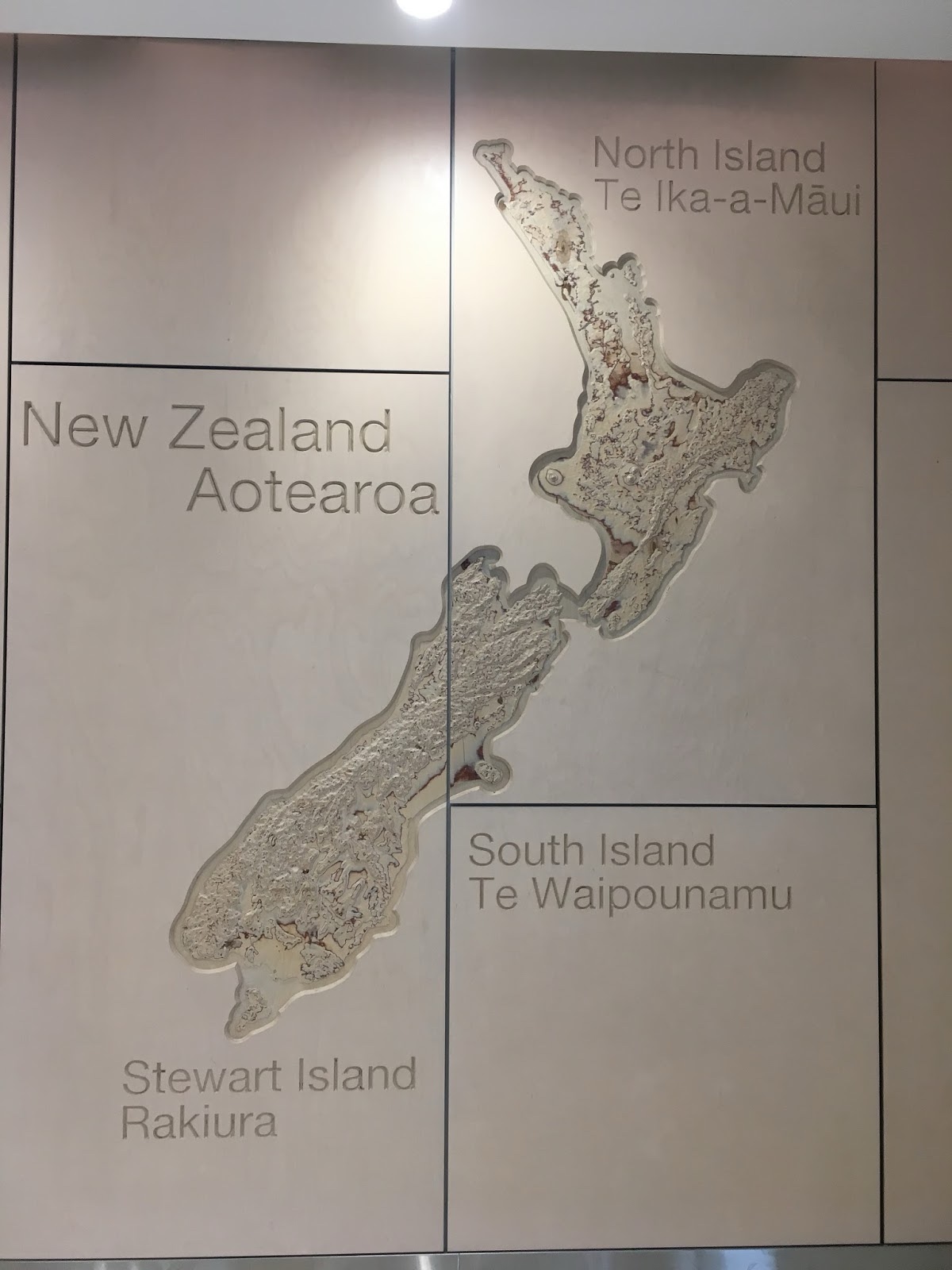 New Zealand has two main islands, usually called the "North Island" and the "South Island". This relief map also includes the Maori word for New Zealand (Aotearoa) and for the individual islands.