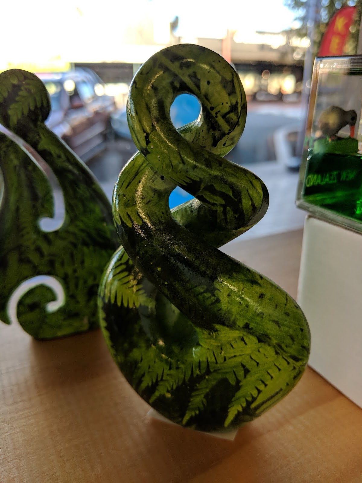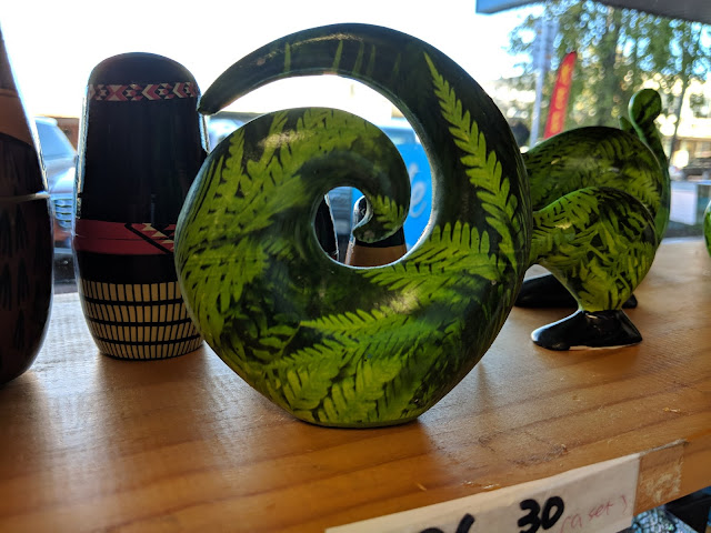 Once back in Rotorua, we went souvenir shopping, and I had fun chatting with the Korean owners of the store where we bought stuff. We often saw some common Maori symbols. This swirl is called the "koru", and symbolizes "new beginnings, growth and regeneration." It is meant to look like a fern frond, and goes with the saying, "Ka hinga atu he tete-kura - ka hara-mai he tete-kura", or, "As one fern frond dies - one is born to take its place". Kind of like "The Circle of Life."