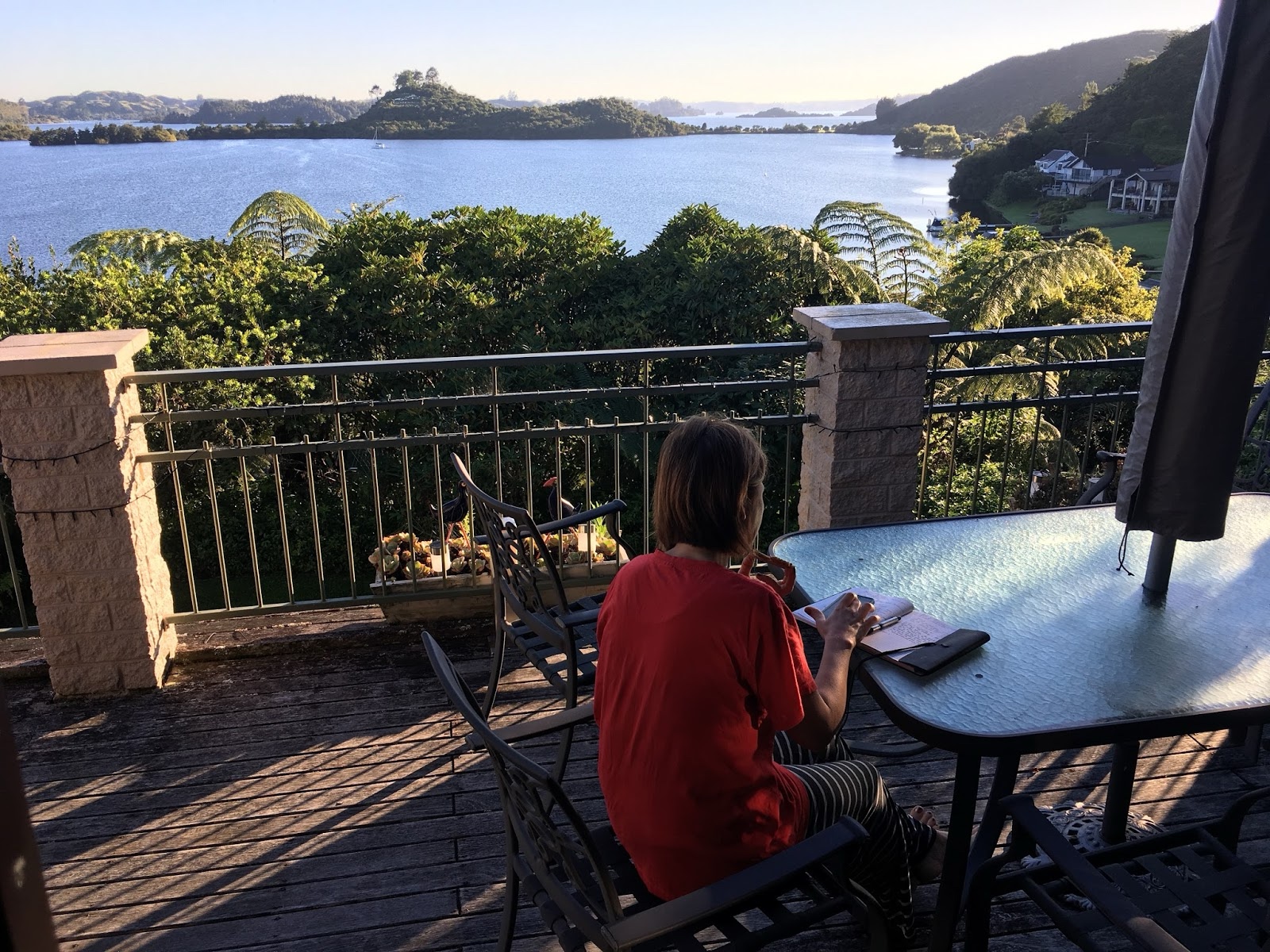 Friday morning, February 16, 2018, we "took our breakfast out of doors." Like when I grew up in Oregon, you did have to do a sweep for spider webs in the morning, but the view was worth it.