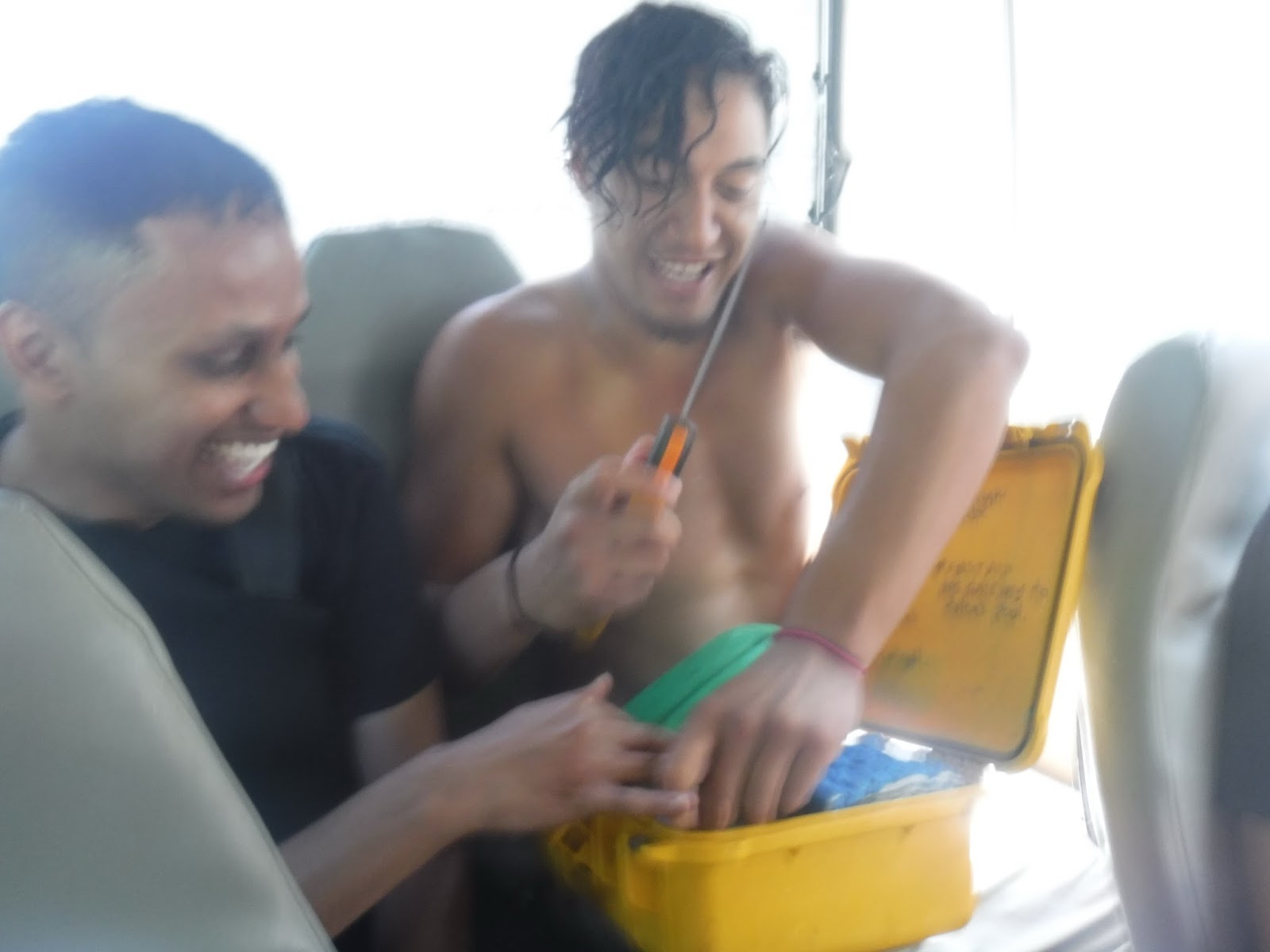 One guy had cut his finger a bit, so our guide opened up their first aid kid. Inside was, among other things, a folding rusty saw blade! I asked what in the world that was in there for!? Here he is pretending to take care of the guy's hurt finger with the rusty saw.