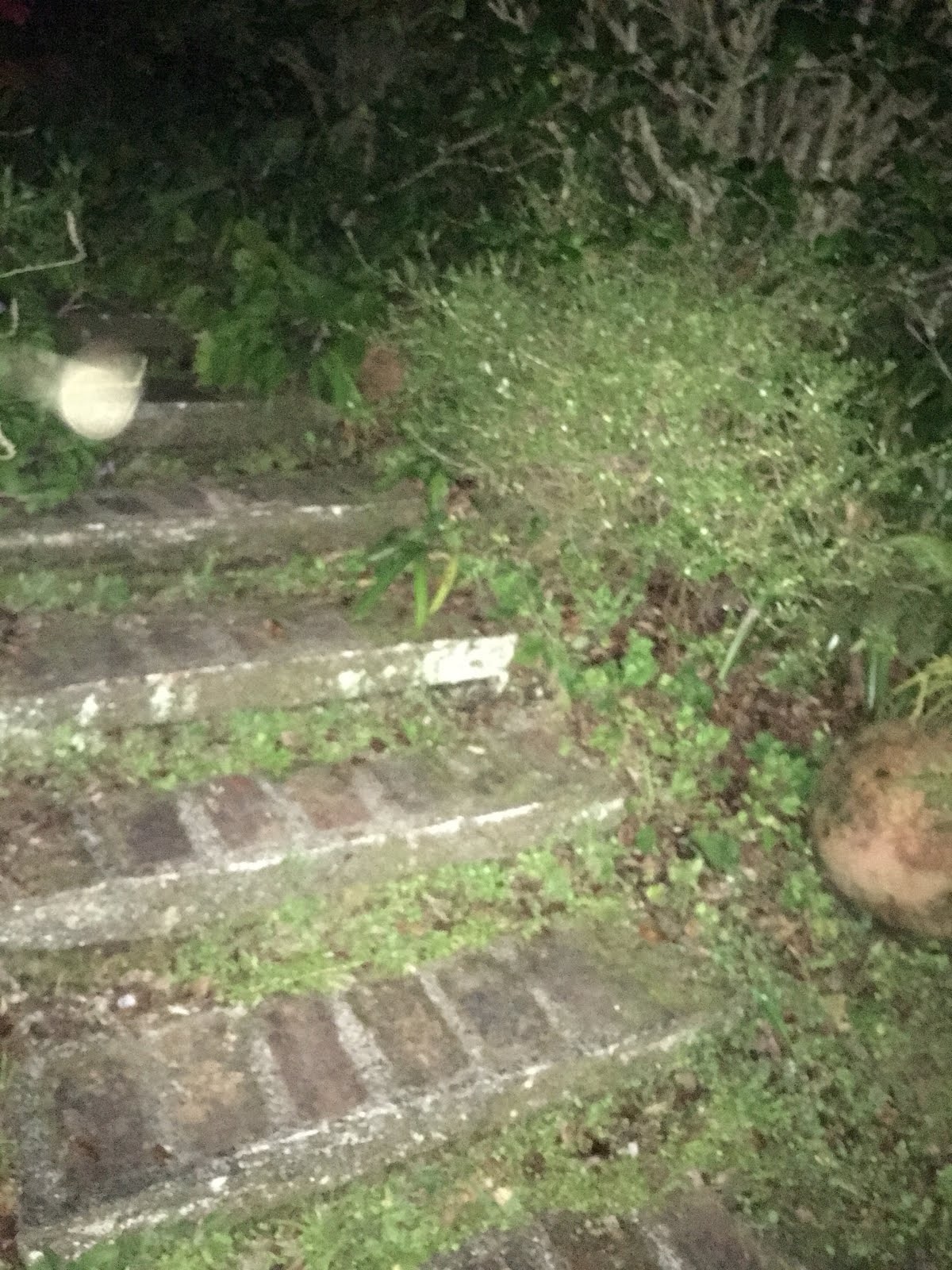 While we were trying to look at the stars, we heard a rustling in the bushes, and I shined a light down just in time to see this big hedgehog wander out of the bushes, glance around, and then mosey back in. Here's my terrible picture of it. (It's the brown fuzzy thing by the top step).