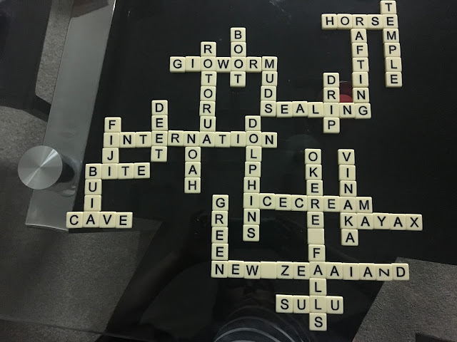 Linette was bummed that nobody would play games with her that night (everyone was tired and had to pack), so she used the Bananagrams letters to create an impressive crossword of all the things we did on our trip.
