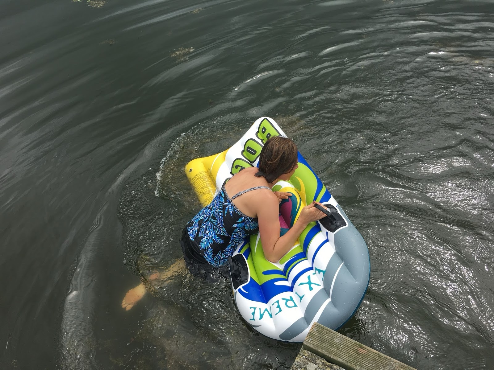 After jogging, we decided to go swimming. Linette used our inflatable boogie board. She carefully climbed onto it, and then it unceremoniously dumped her face first into the water.