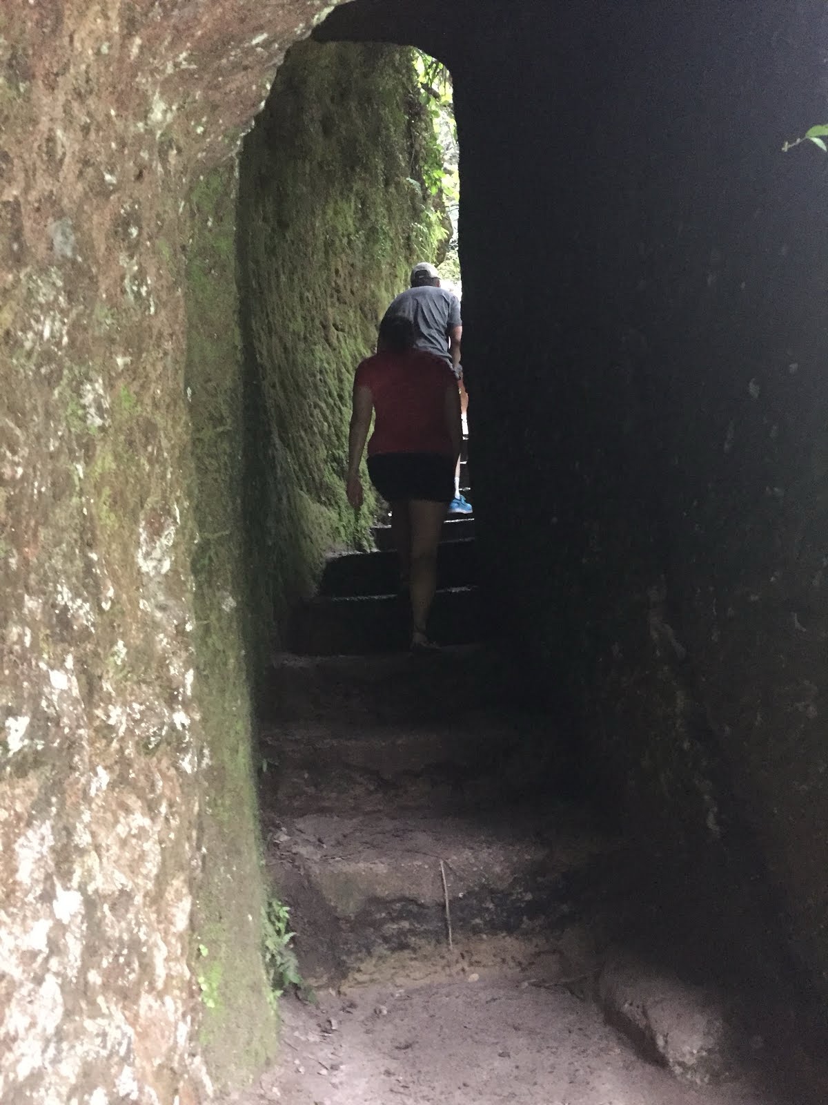 There was a passageway with stairs carved into the rock leading down near the water, and a cave down there that was blocked off. This gave us a brief respite from the rain.