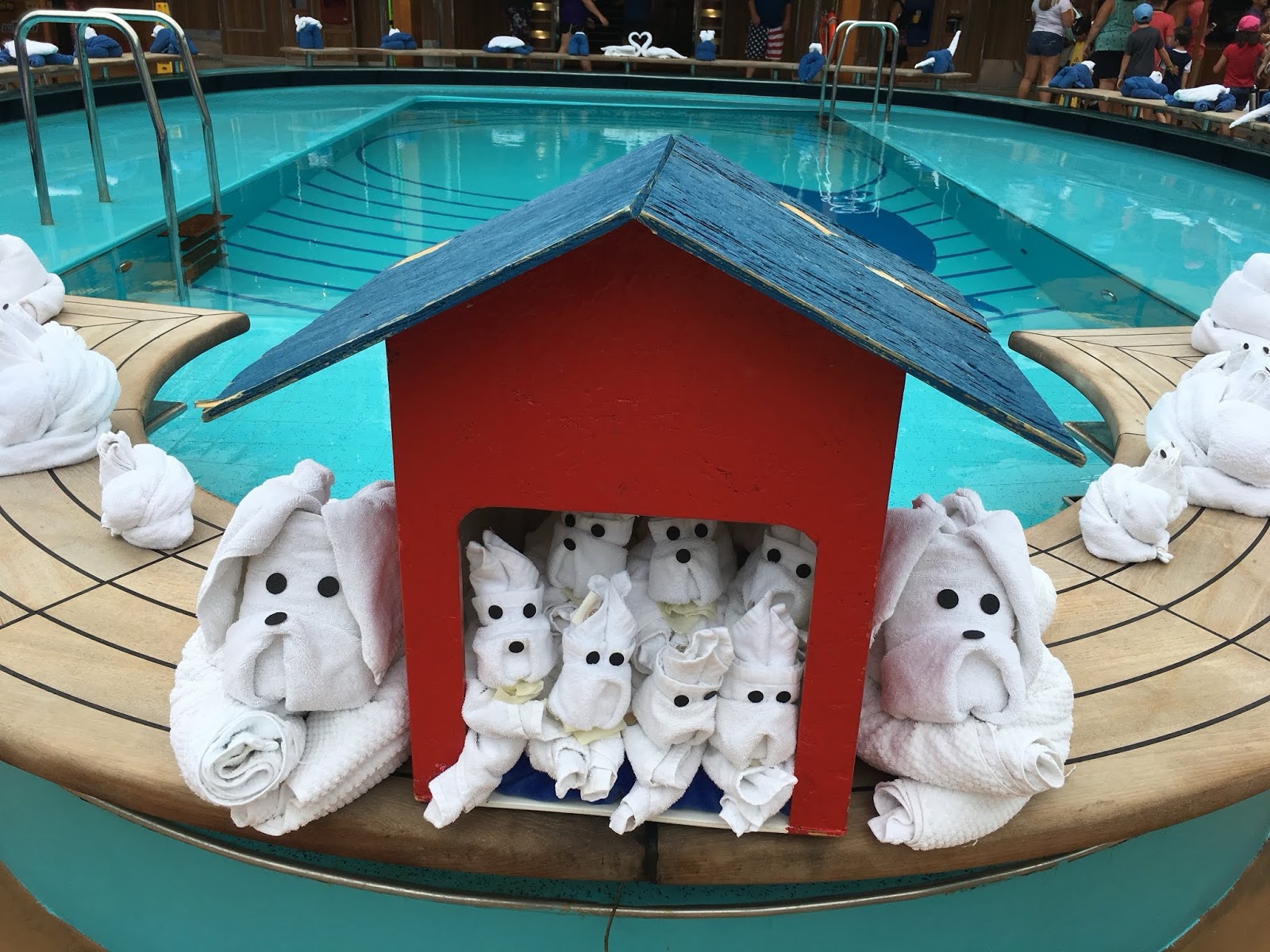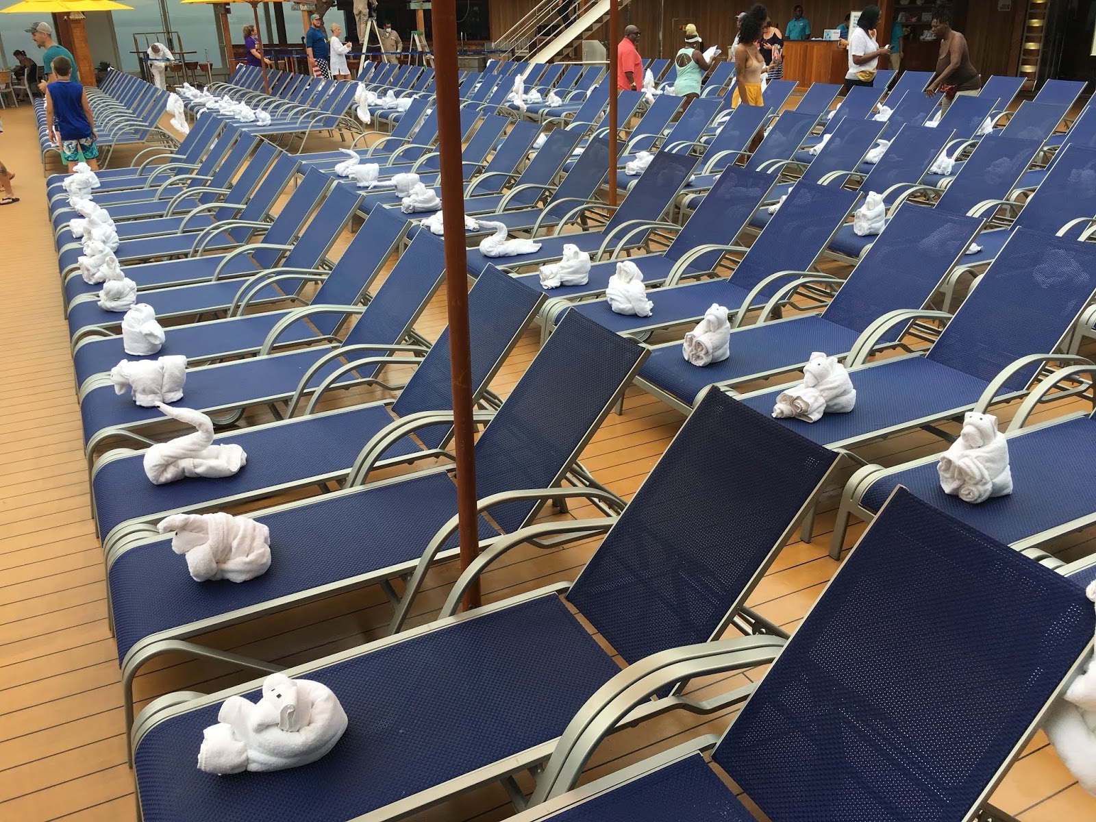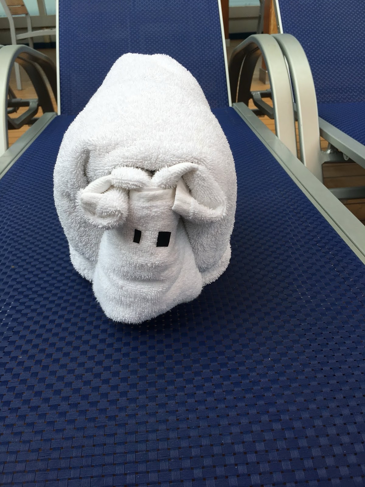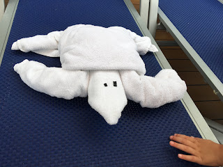 Friday morning, August 10, 2018, we went up on deck to find that the towel animals had been up all night watching a movie! (Or so it seemed).
