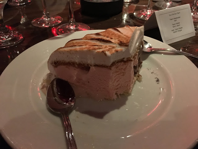 That evening I wasn't sure whether to get the prime rib or the flat iron steak, so I got them both (may as well), topped off by "baked Alaska" (Neapolitan ice cream with a flamed meringue top).