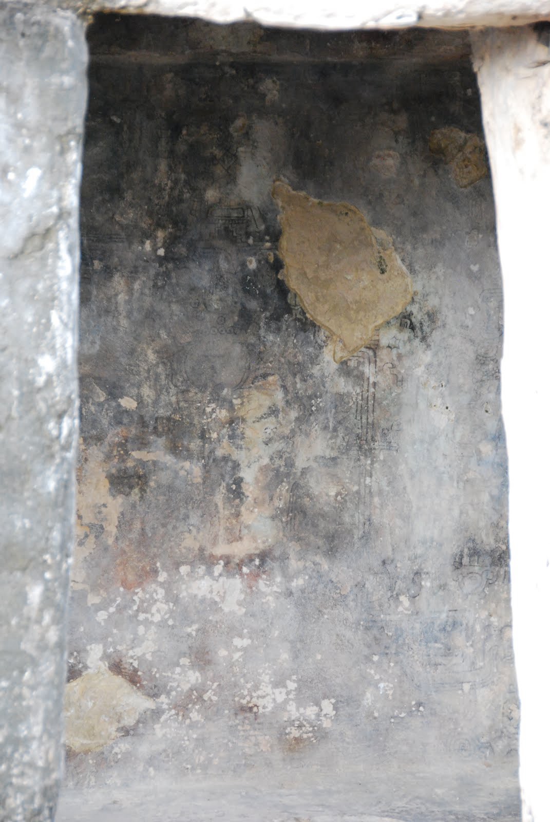 Looking between pillars on this building there are some ancient drawings just barely visible.