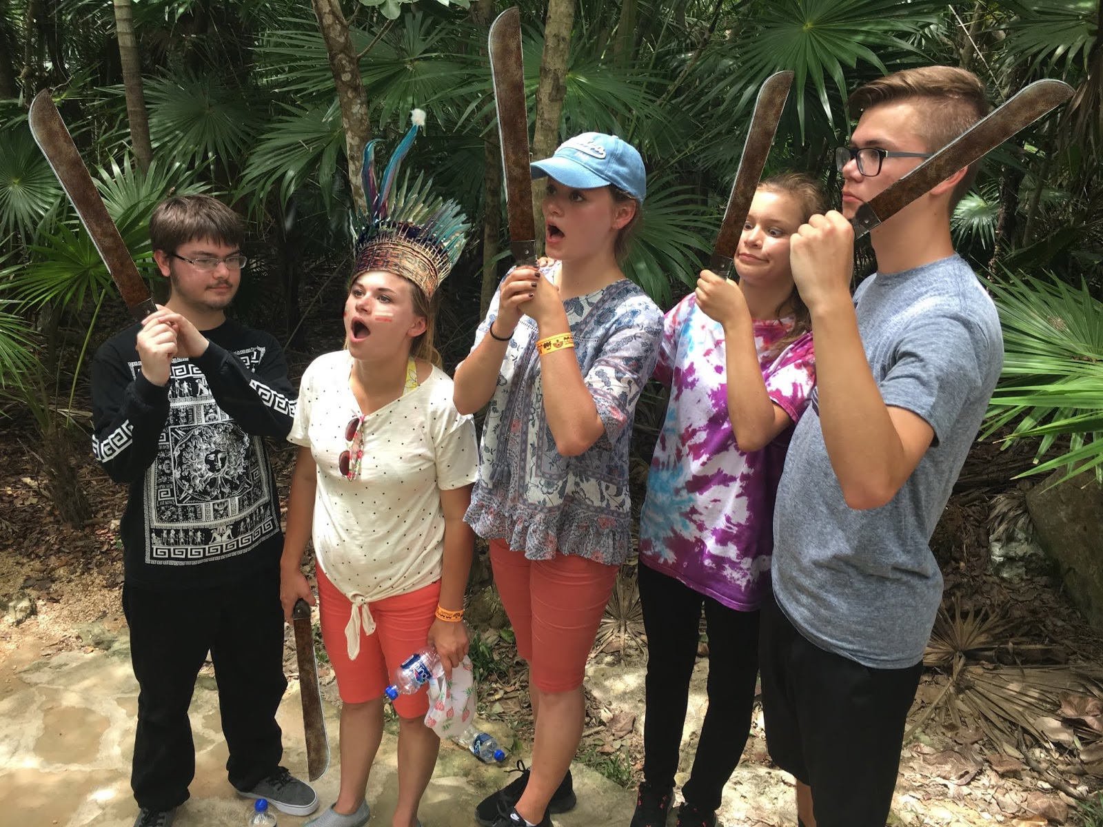 In a jungle path, I had the kids all pretend to be holding a machete. Then I photoshopped one into each of their hands. (Not sure what Kelsi was doing, so I threw a feather crown on her).