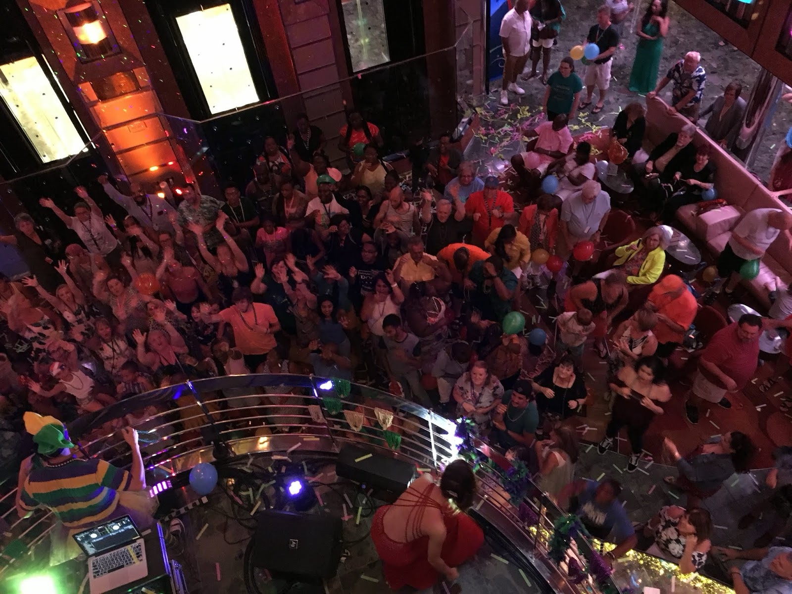 After dinner we noticed a Mardi Gras celebration going on, where they were throwing beads and stuff down to people. A band went by playing "When the Saints Go Marching In".