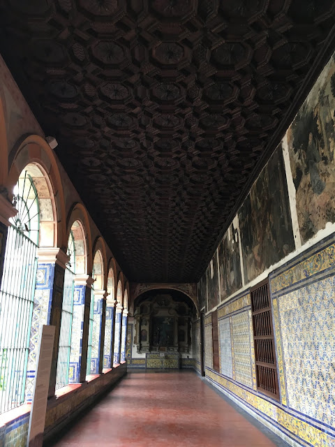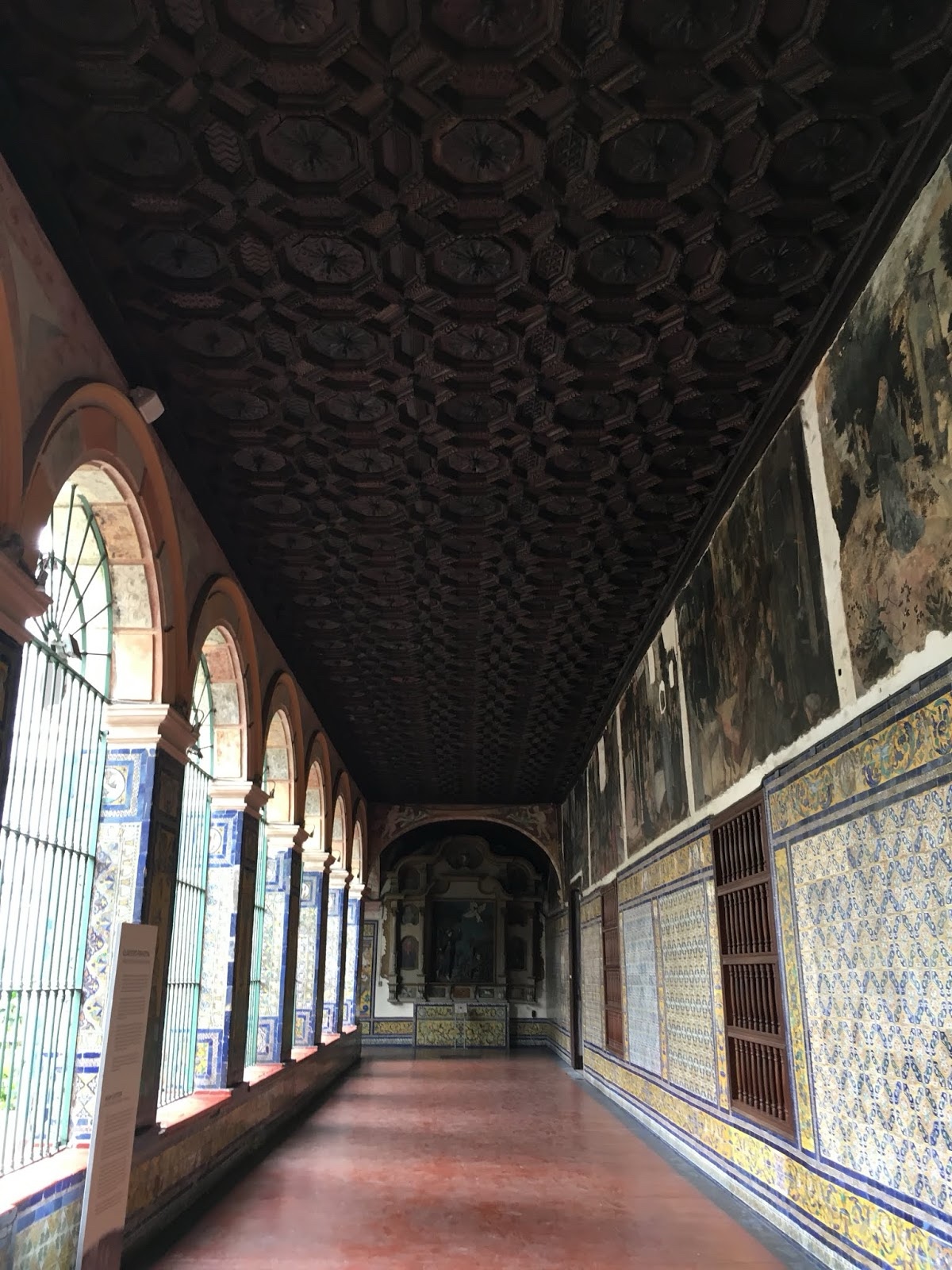 Outside of the main rooms are covered walkways with cool arches and ornate ceilings. Someone discovered that under the white plaster on the walls were frescoes that had been painted back when the cathedral was built, so those have been uncovered and restored.
