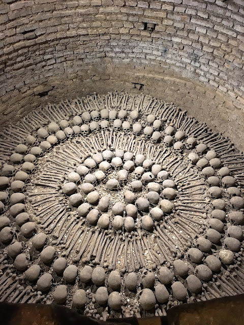 Apparently the priests would take a body, treat it with quick lime to dissolve it down to bones, and then stack the skeletons up to 15 feet deep in stone chambers. Then one day someone (perhaps someone with OCD) decided to reorganize all the bones by category, and then people made artwork out of them. I'm not sure I'm on board with this plan, but it was definitely something.