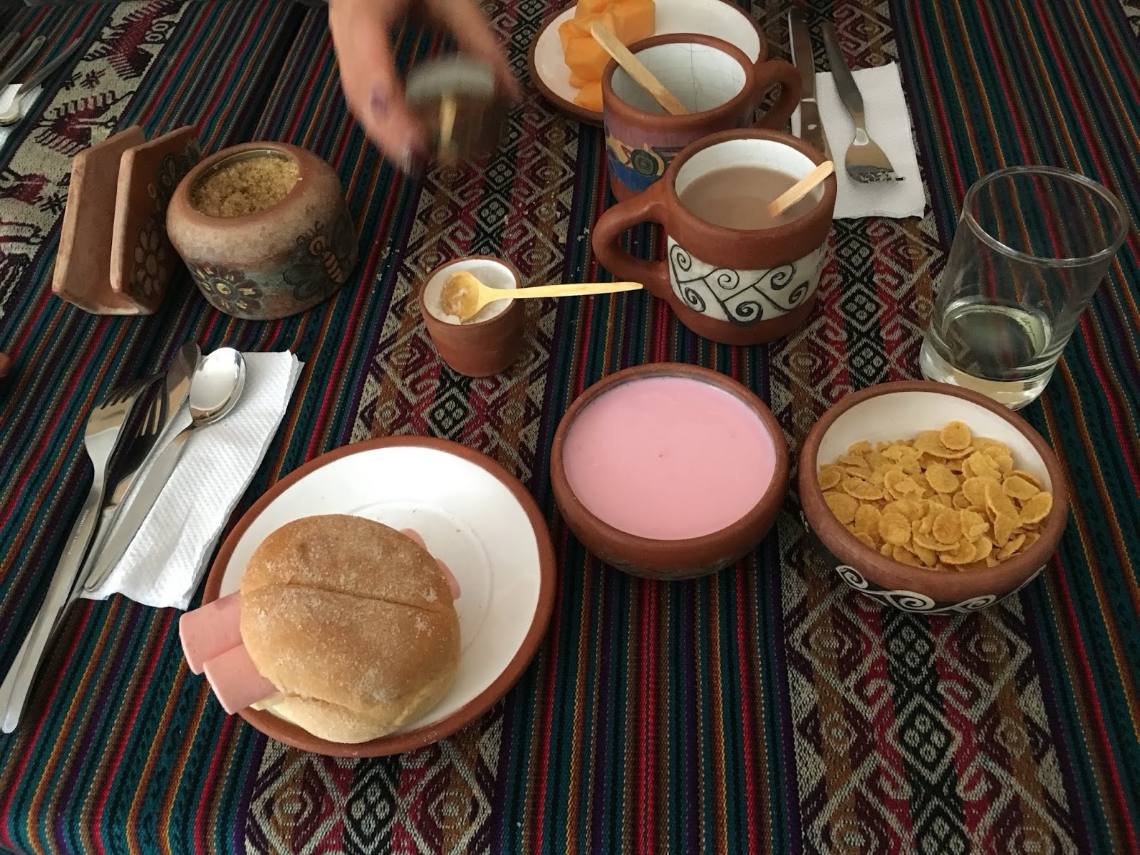 Breakfast at the hotel included cereal (Post Toasties, I believe); hot chocolate; yogurt; and some European-style offerings like bread with meats and cheeses.