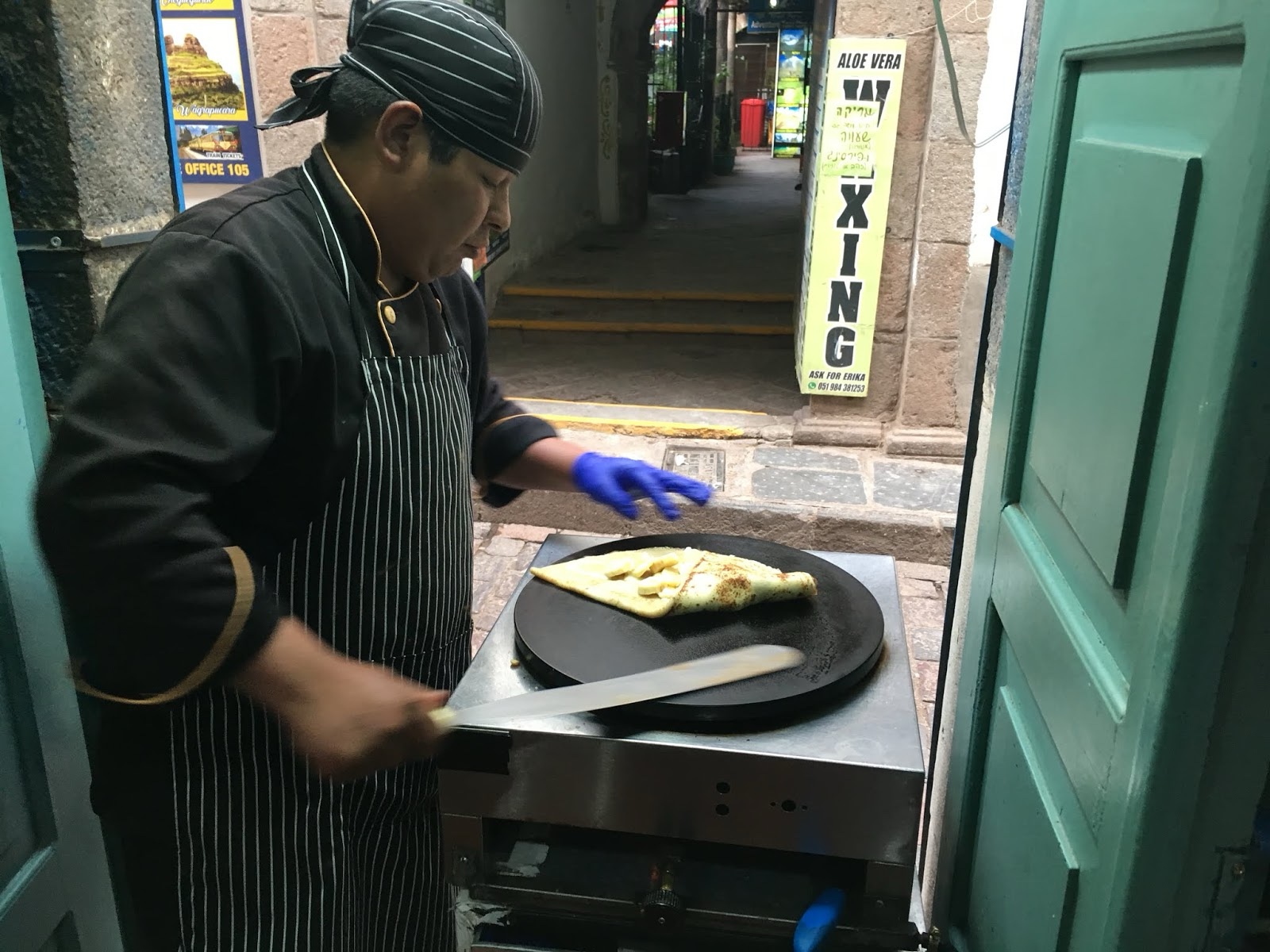 Meanwhile, across the alley, everyone else was getting crepes from a guy who pours the batter onto a round plate that's hot. So kinda the same but opposite.