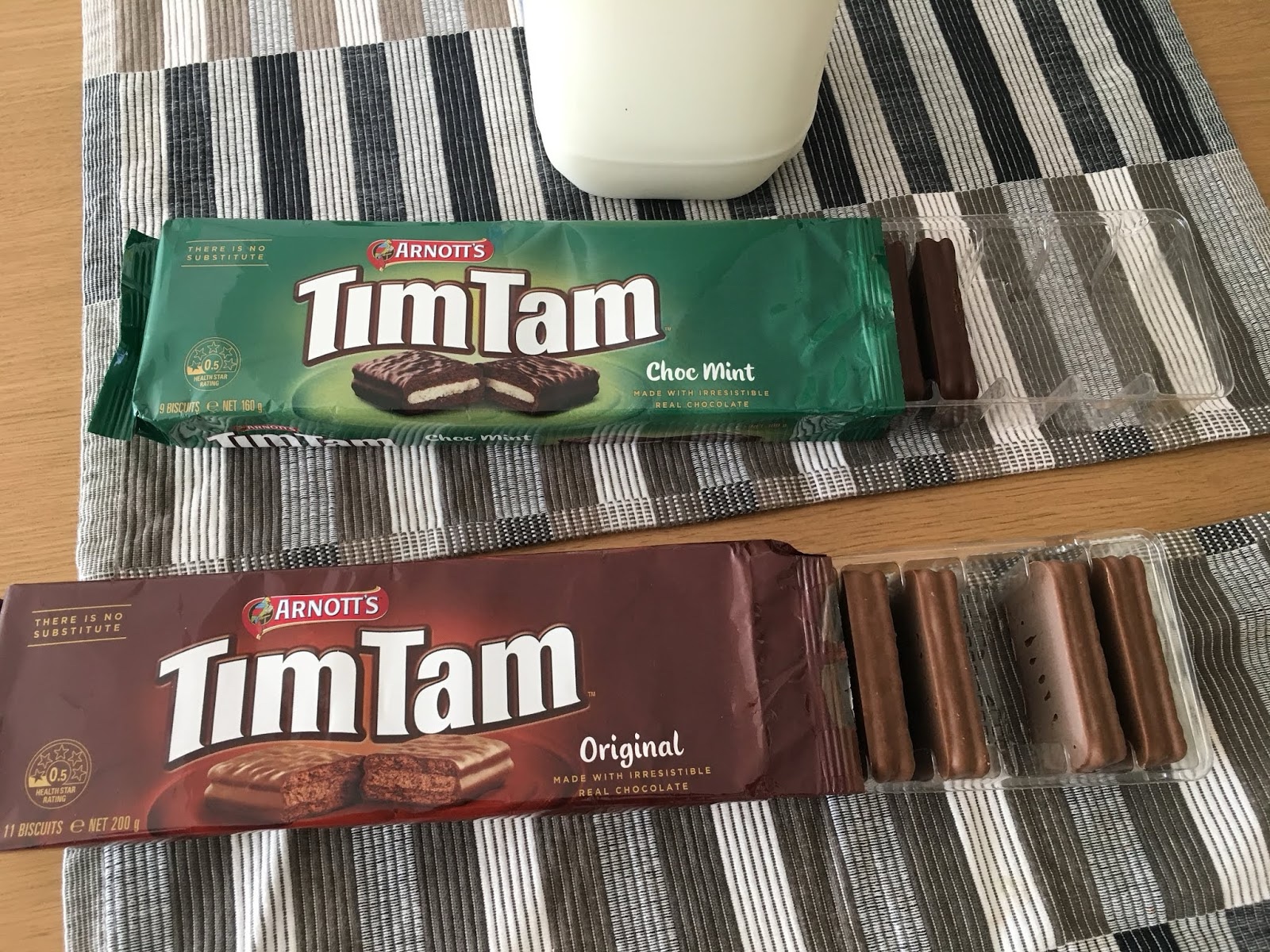 I also got two kinds of Tim Tams, which are amazing "biscuits" (cookies) with chocolate cookies, chocolate or mint or caramel filling, and dipped in chocolate. If you bite off two corners, you can suck milk or hot chocolate through them like a straw, and it softens them up so they melt in your mouth. This is know as a "Tim Tam Slam." Which I did most mornings with the leftover milk from my cereal. It was "tasty as." (Aussies will often say things like "That's awesome as," and let your imagination fill in the blank.)