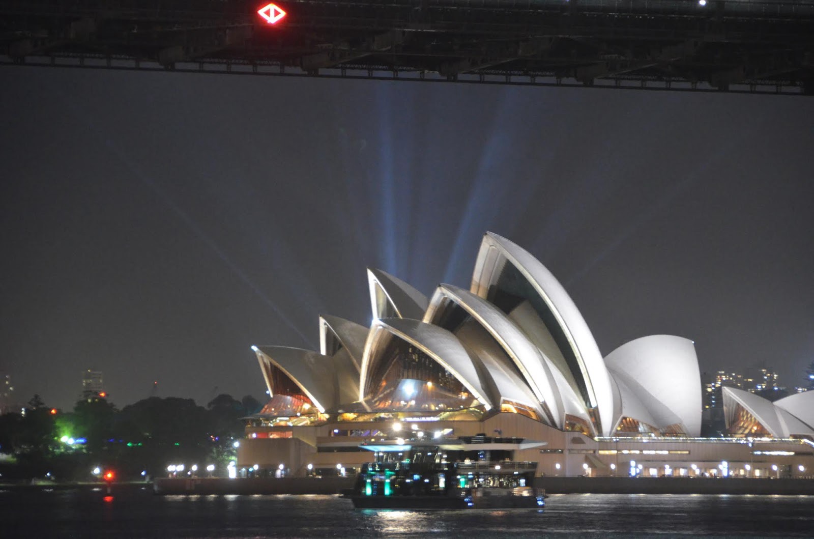 | Sydney Opera House from under the Harbor Bridge, with "Light the City" going on behind it at Mrs. Macquarie's Point. |
