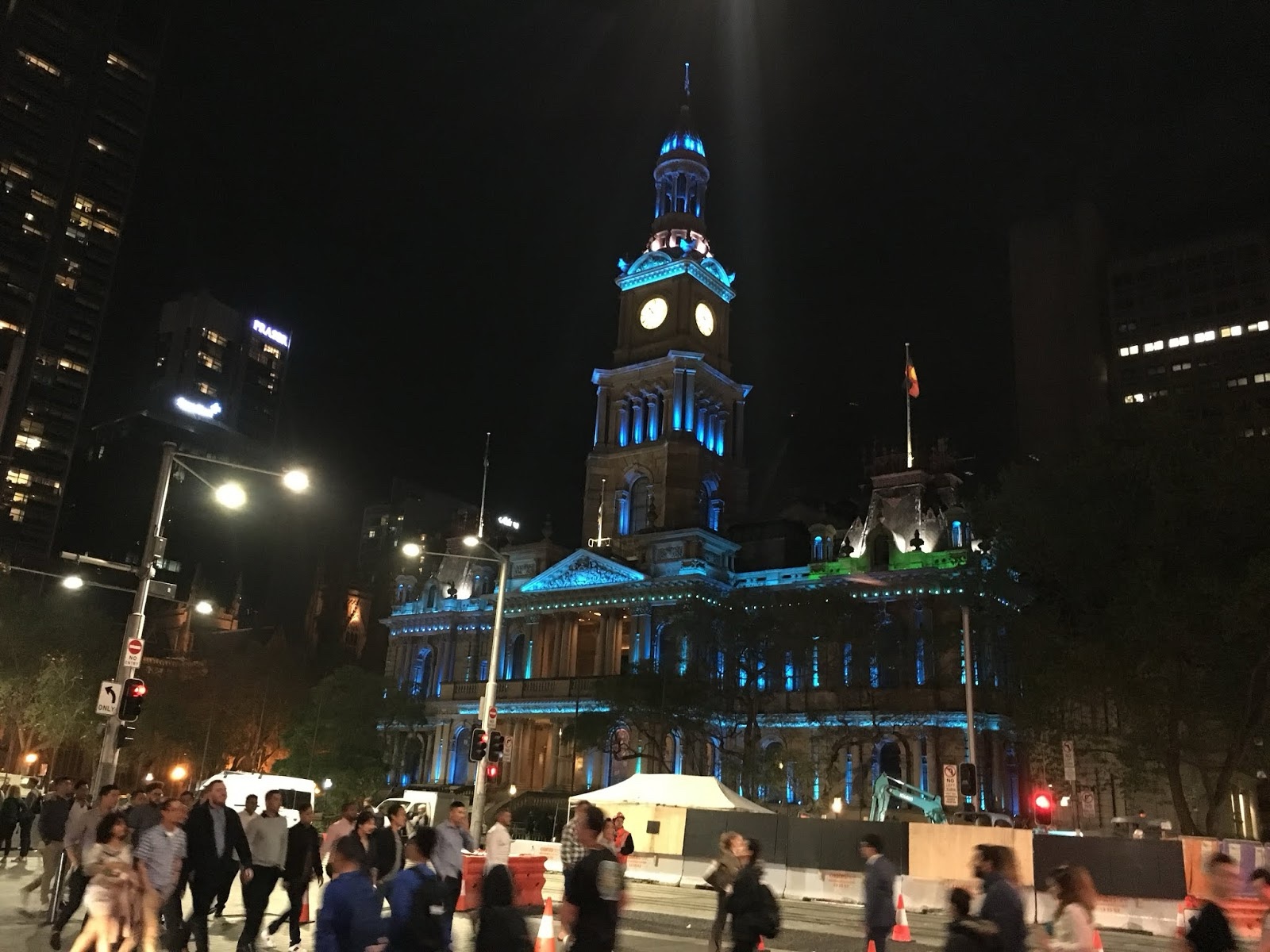 On the long walk back to the apartment, we saw that the Sydney Town Hall was lit up all cool like.