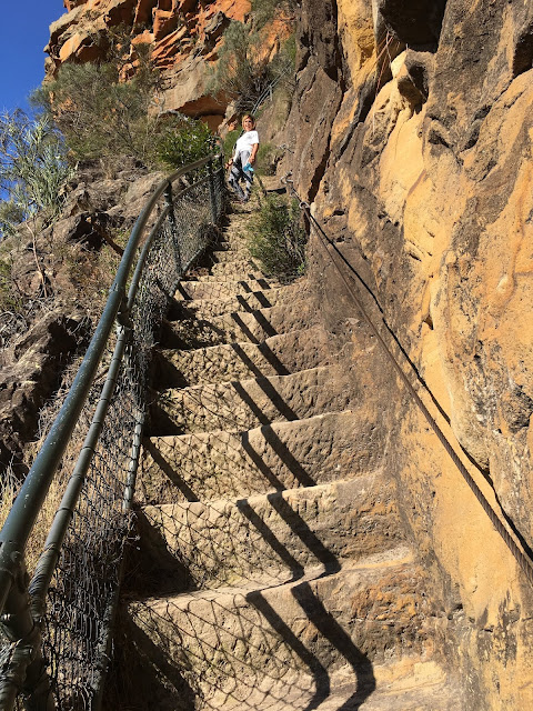 Stairs went down and down along the side of the cliff. We had already hiked a while that day, and what we all kept thinking was that we were going to have to go back UP these things.