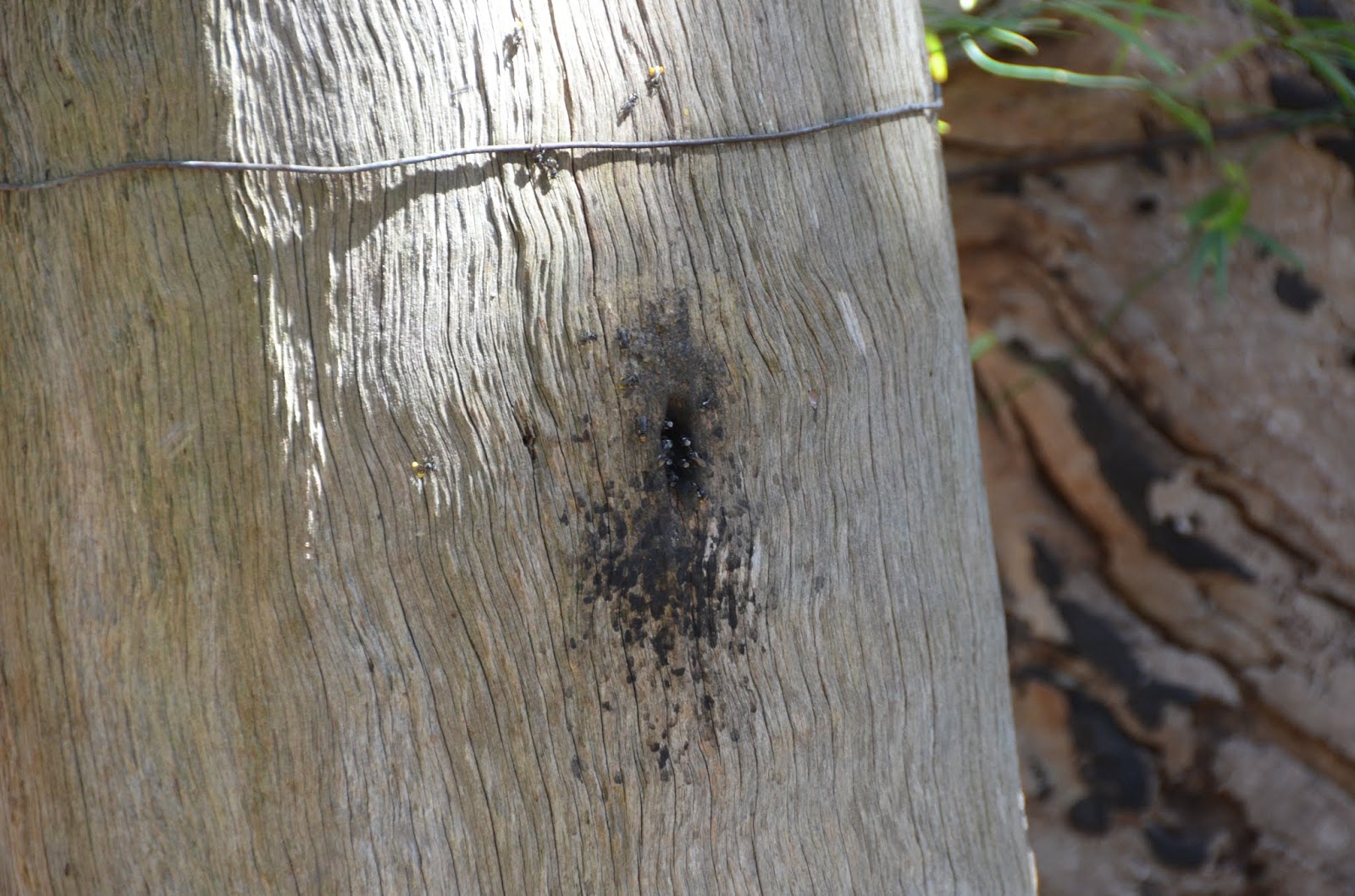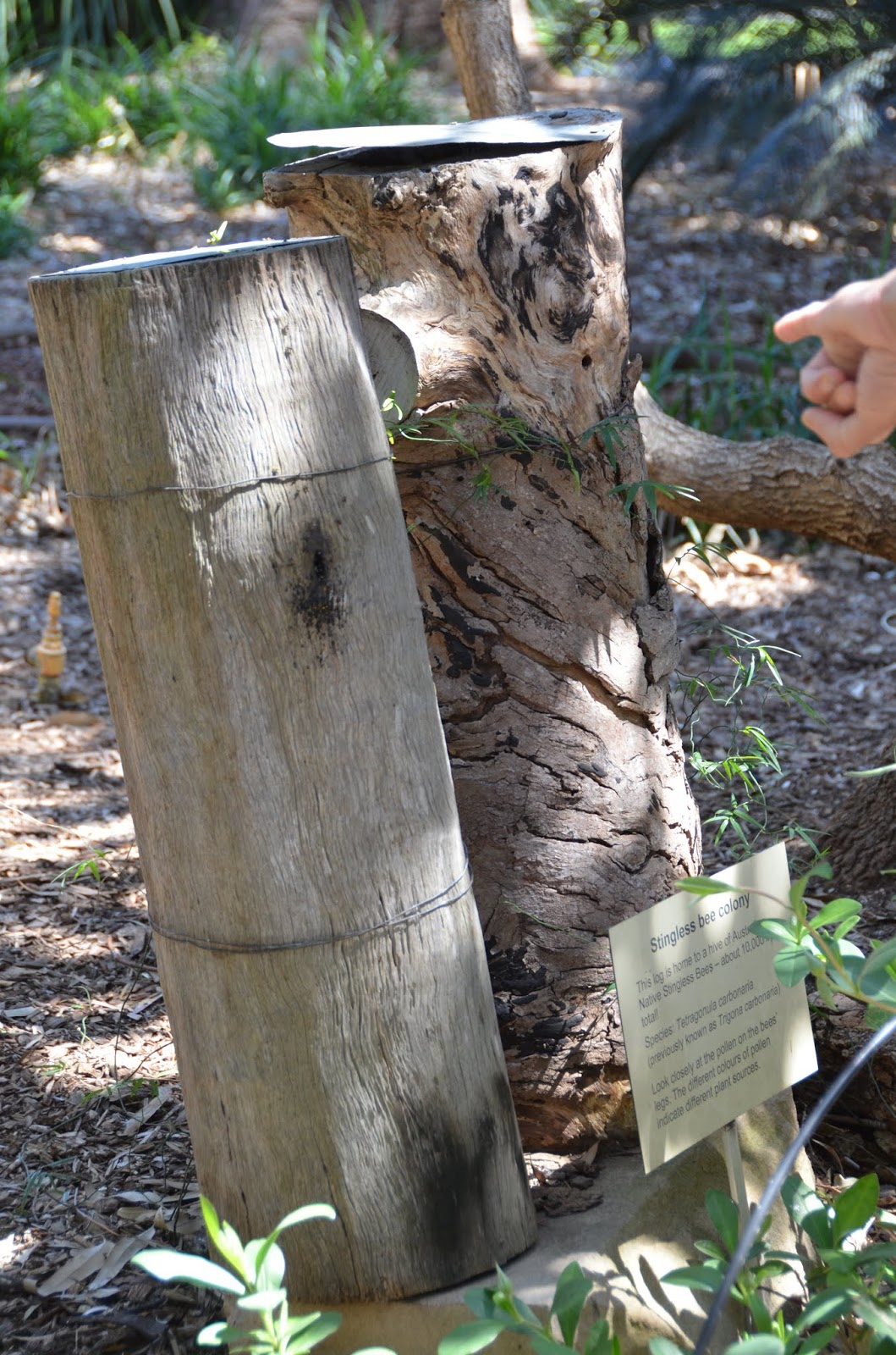 Here is a hive of tiny, native, stingless bees that help pollinate the gardens.