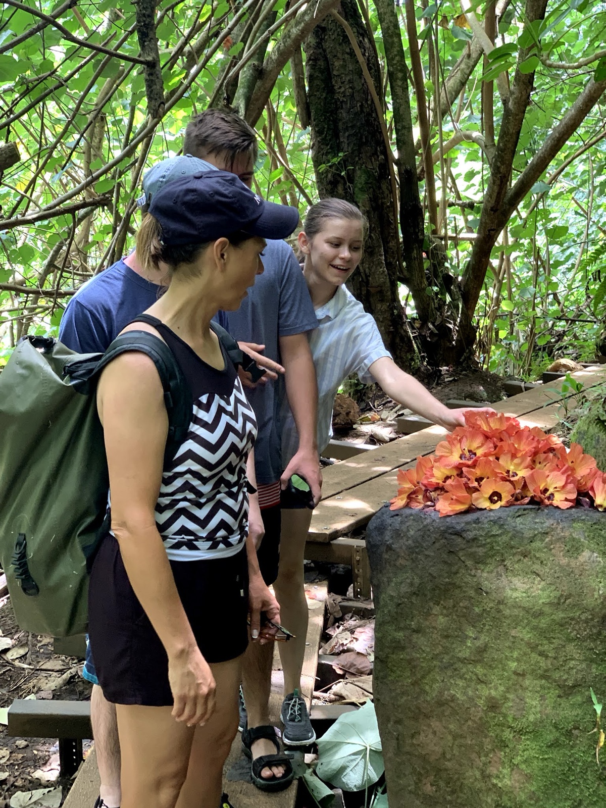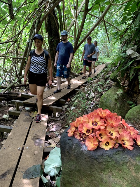 Parts of the trail had a boardwalk to protect the environment and our feet. At one point, there was a little shrine of sorts with pretty flowers.