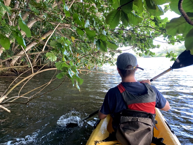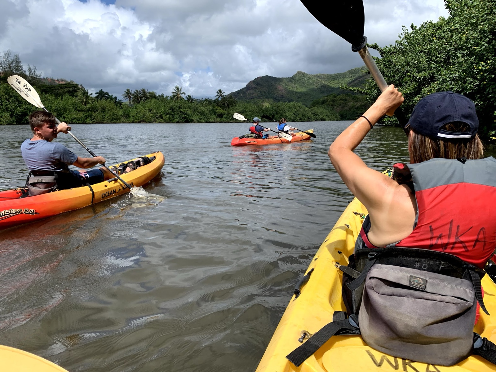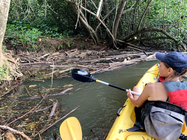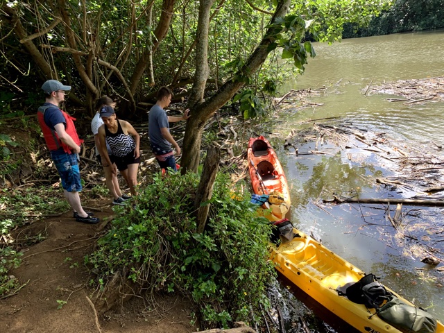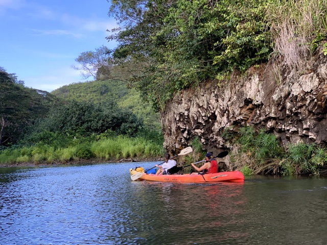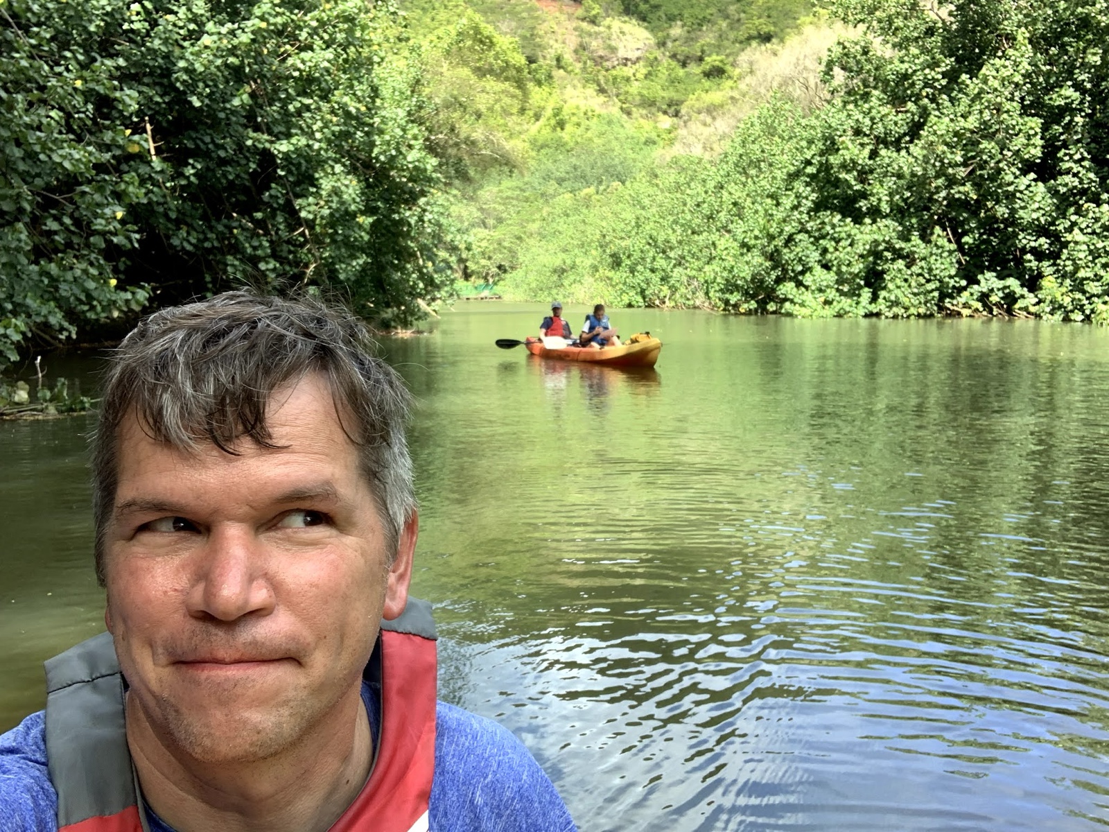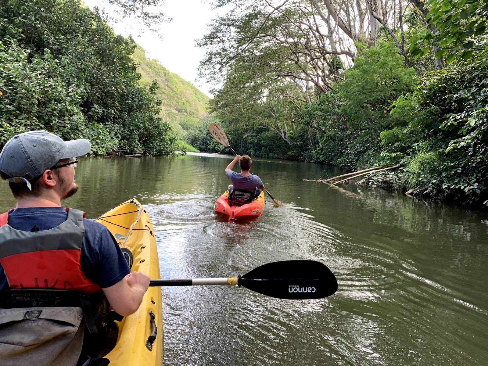 We drove a few minutes to the Wailua River and headed upstream. Adam and Sienna were in one kayak, Linette and I were in another, and Jared had his own.