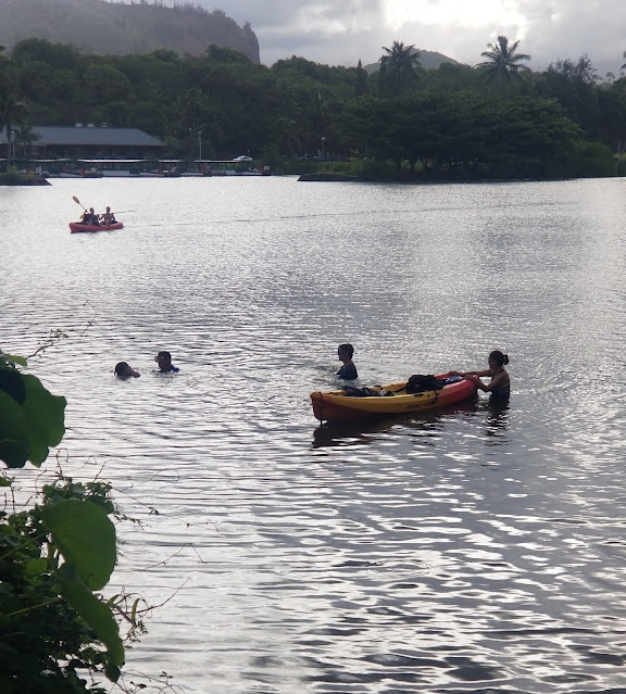 As Jared and the girls neared the dock, Jared really wanted to "win" and be the first one there, so he dug in deep with his paddle and accidentally rolled his kayak.
