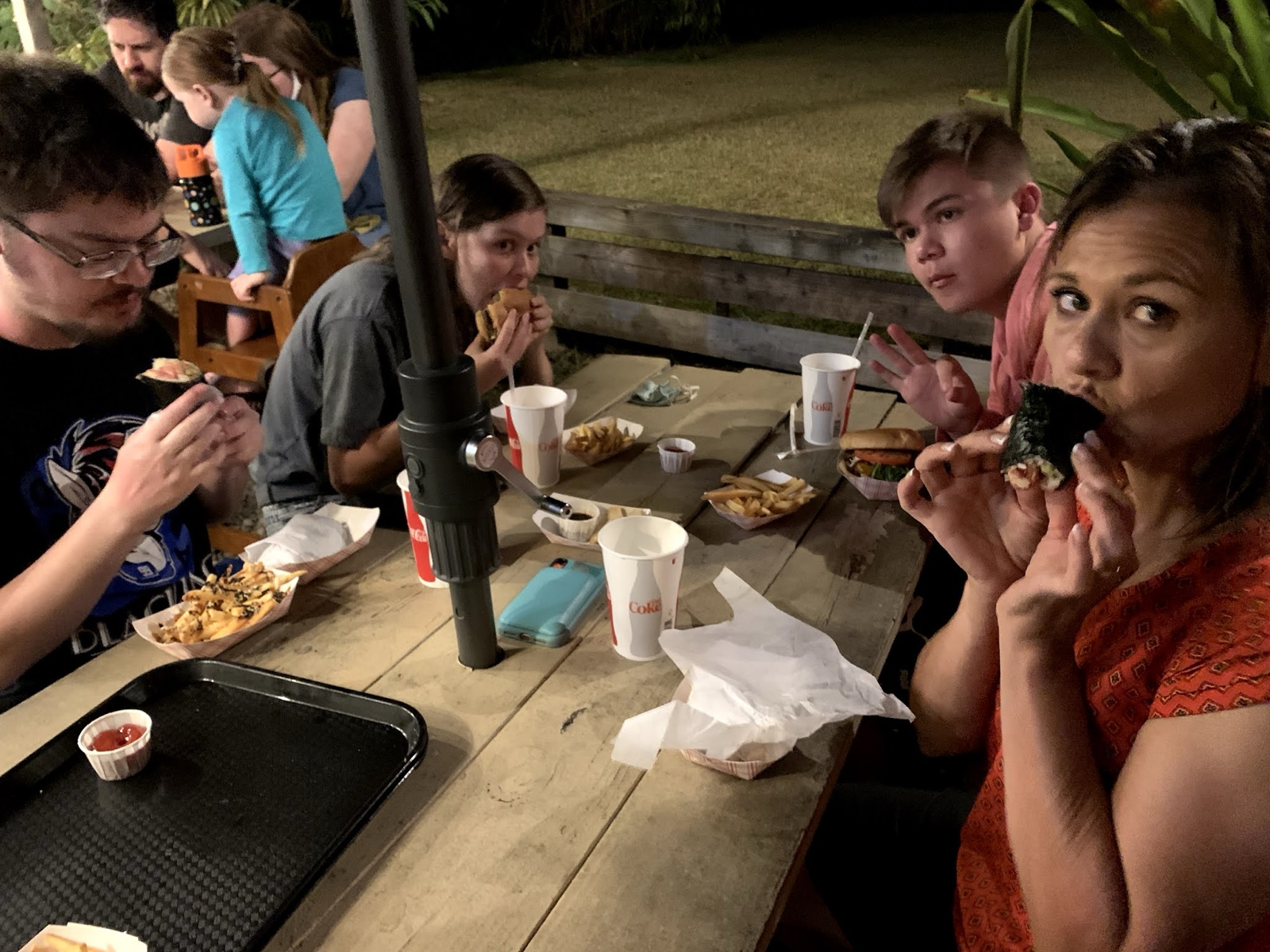 We were all still pretty stoked about the fun day at the river and waterfall, and the victorious search at the end, and we celebrated with some great "sushi burritos" and excellent teriyaki burgers at "Kenji Burger".