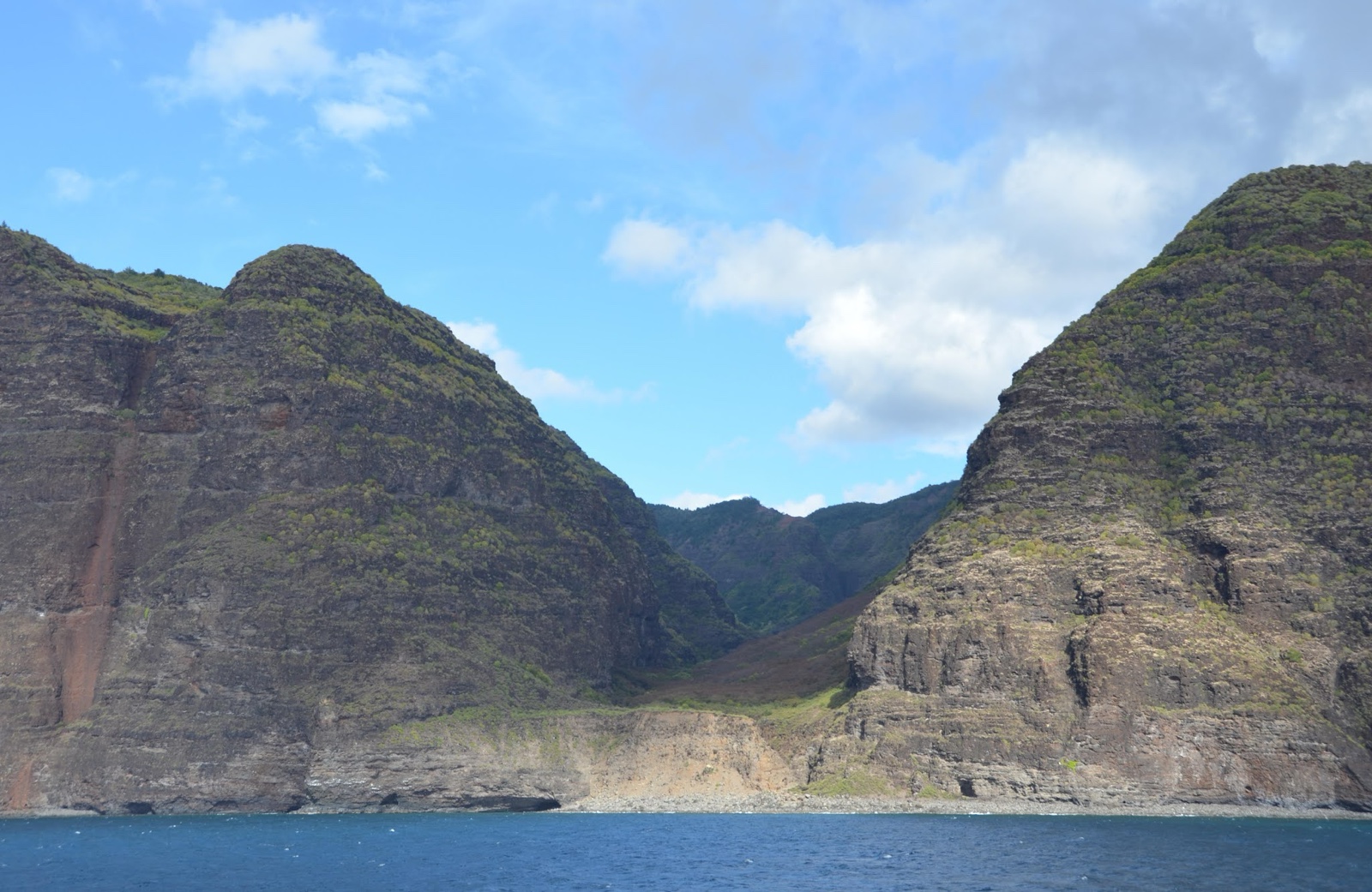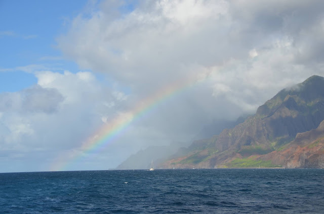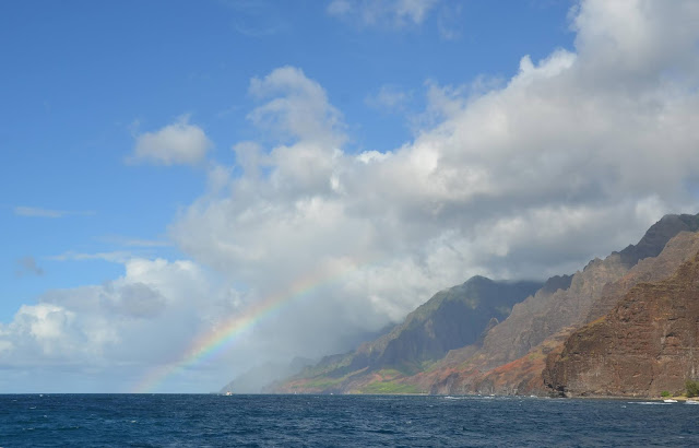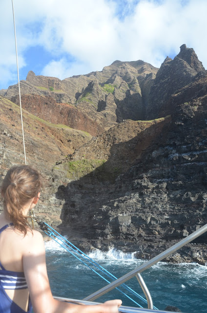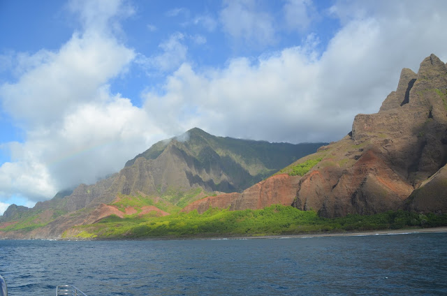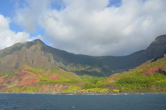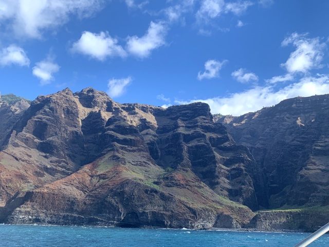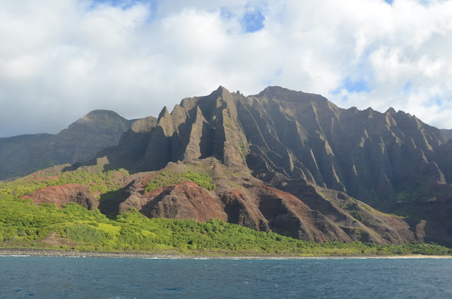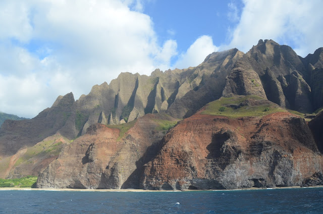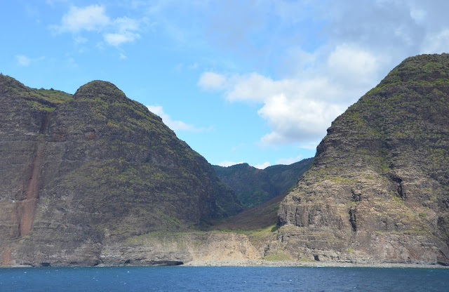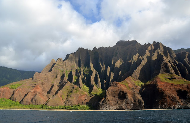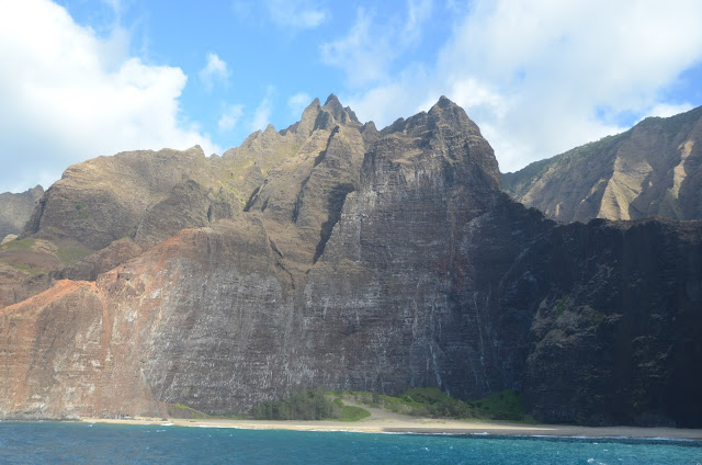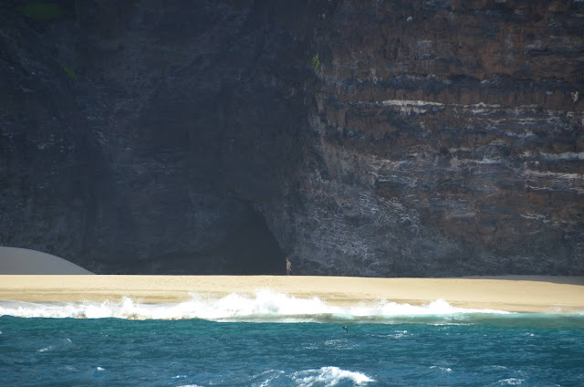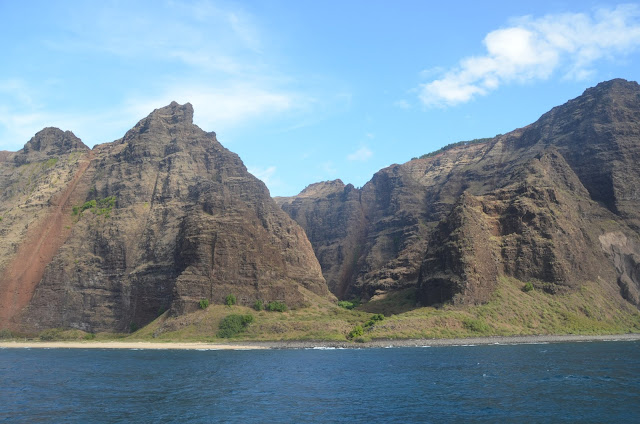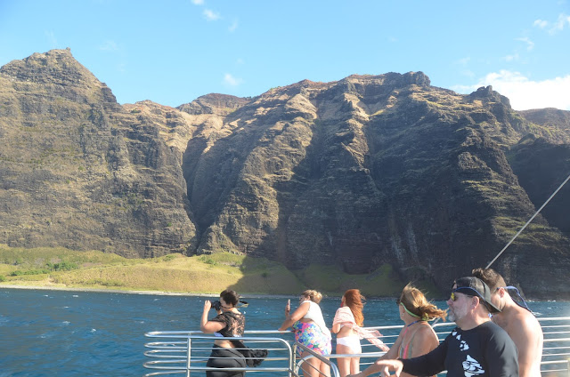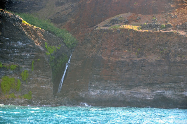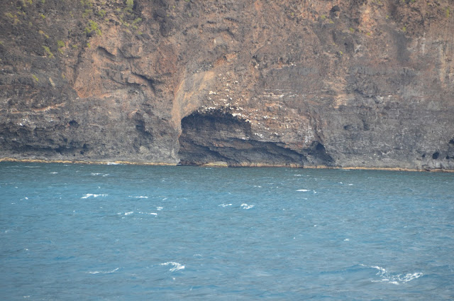 Eventually we left the dolphins behind and started up the Na Pali Coast. This section of Kaua'i has many steep cliffs. There are no roads on this side of the island, so people who go here either kayak or hike. (Or see it by helicopter, like Sharon & Roger did; or by boat, like we did).