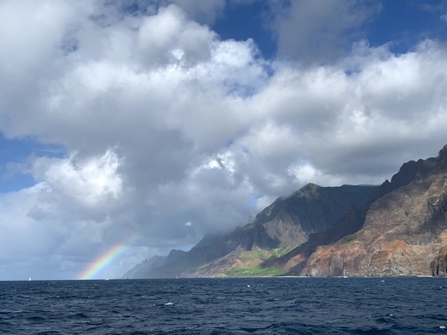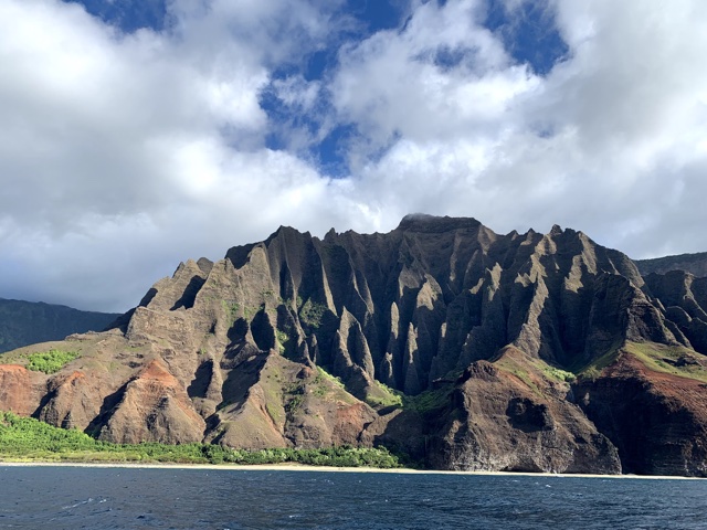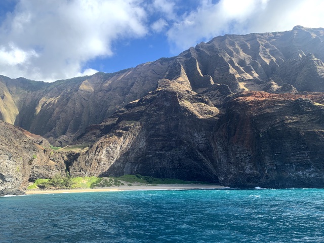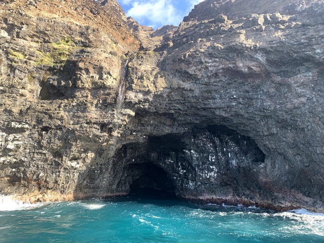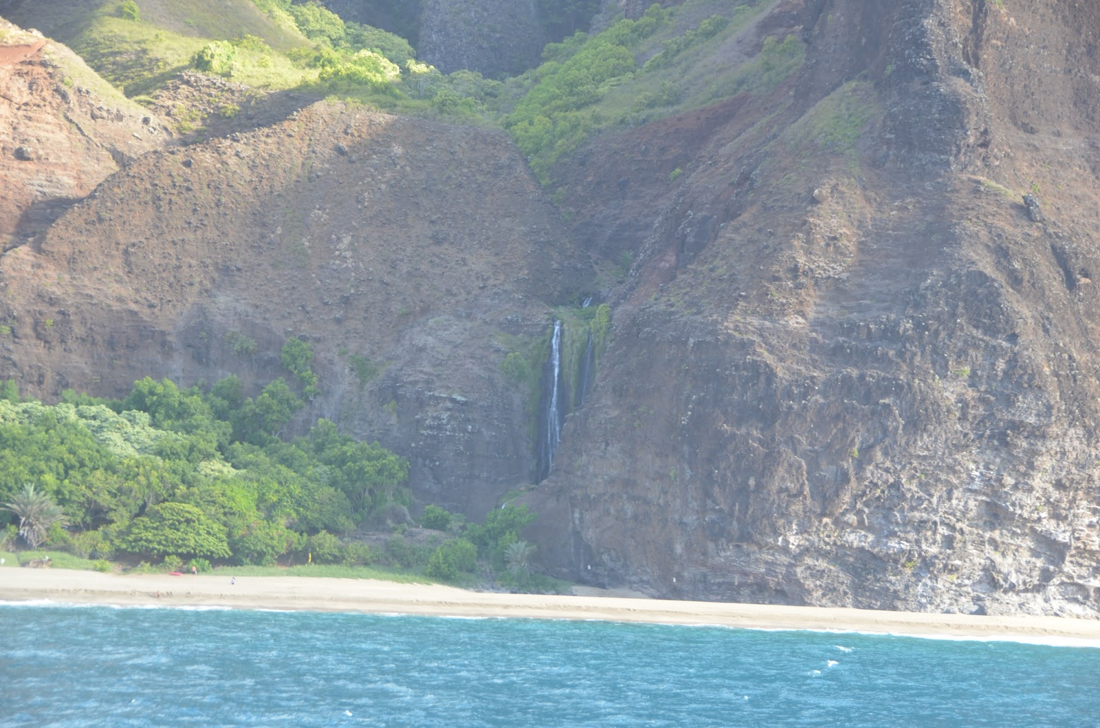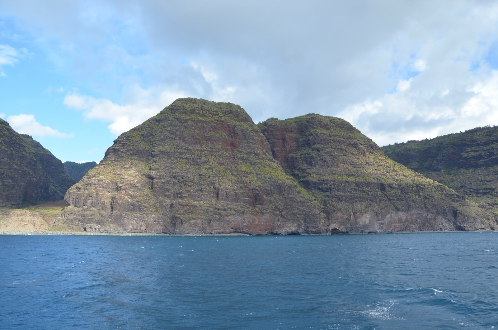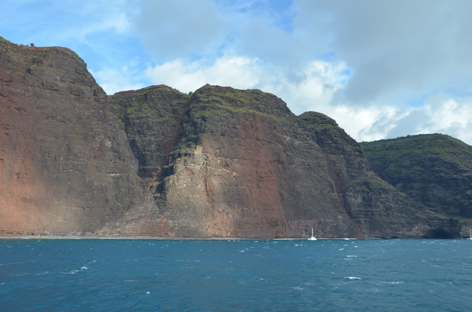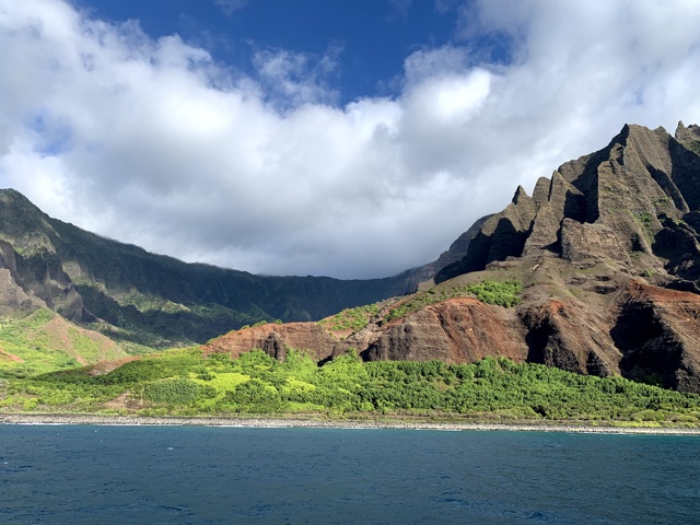 Eventually we left the dolphins behind and started up the Na Pali Coast. This section of Kaua'i has many steep cliffs. There are no roads on this side of the island, so people who go here either kayak or hike. (Or see it by helicopter, like Sharon & Roger did; or by boat, like we did).