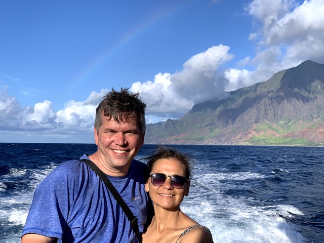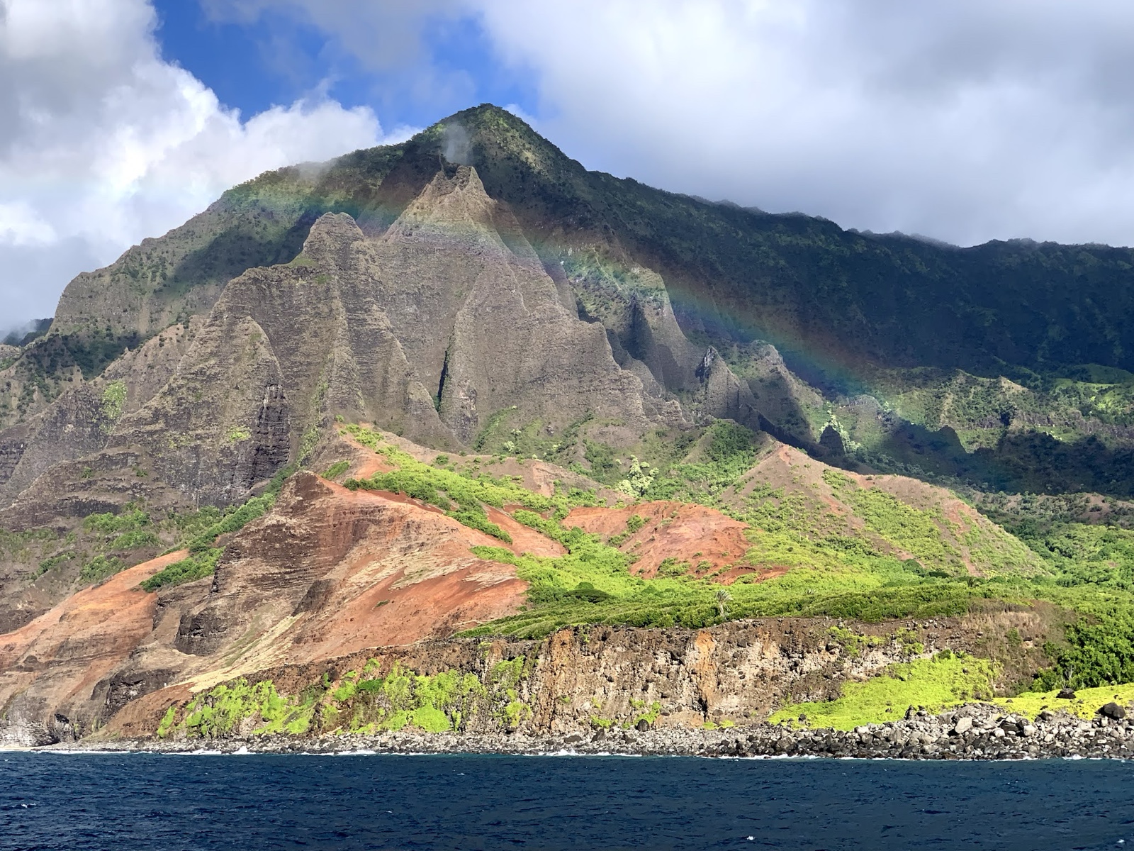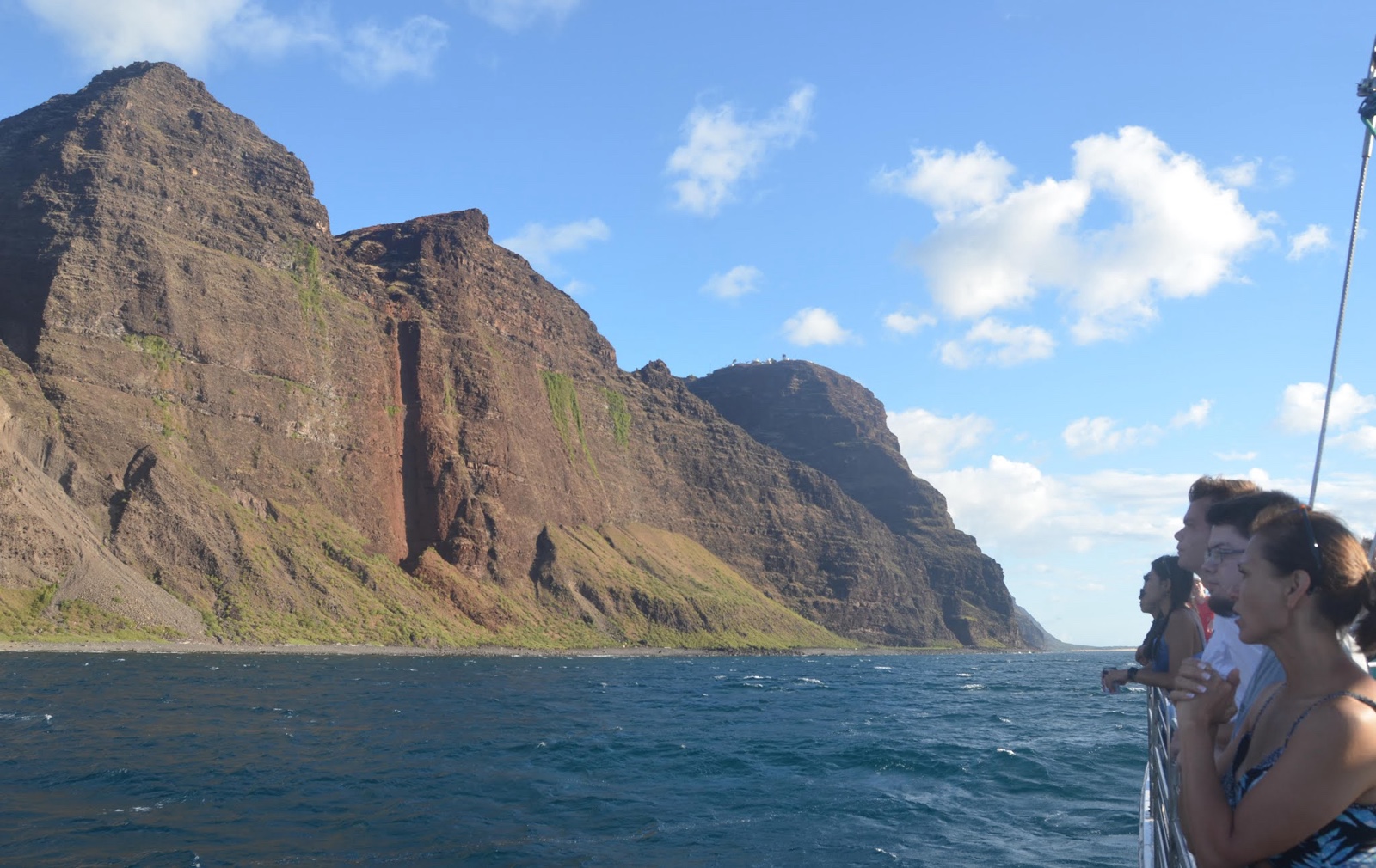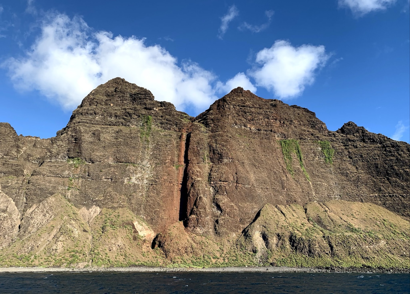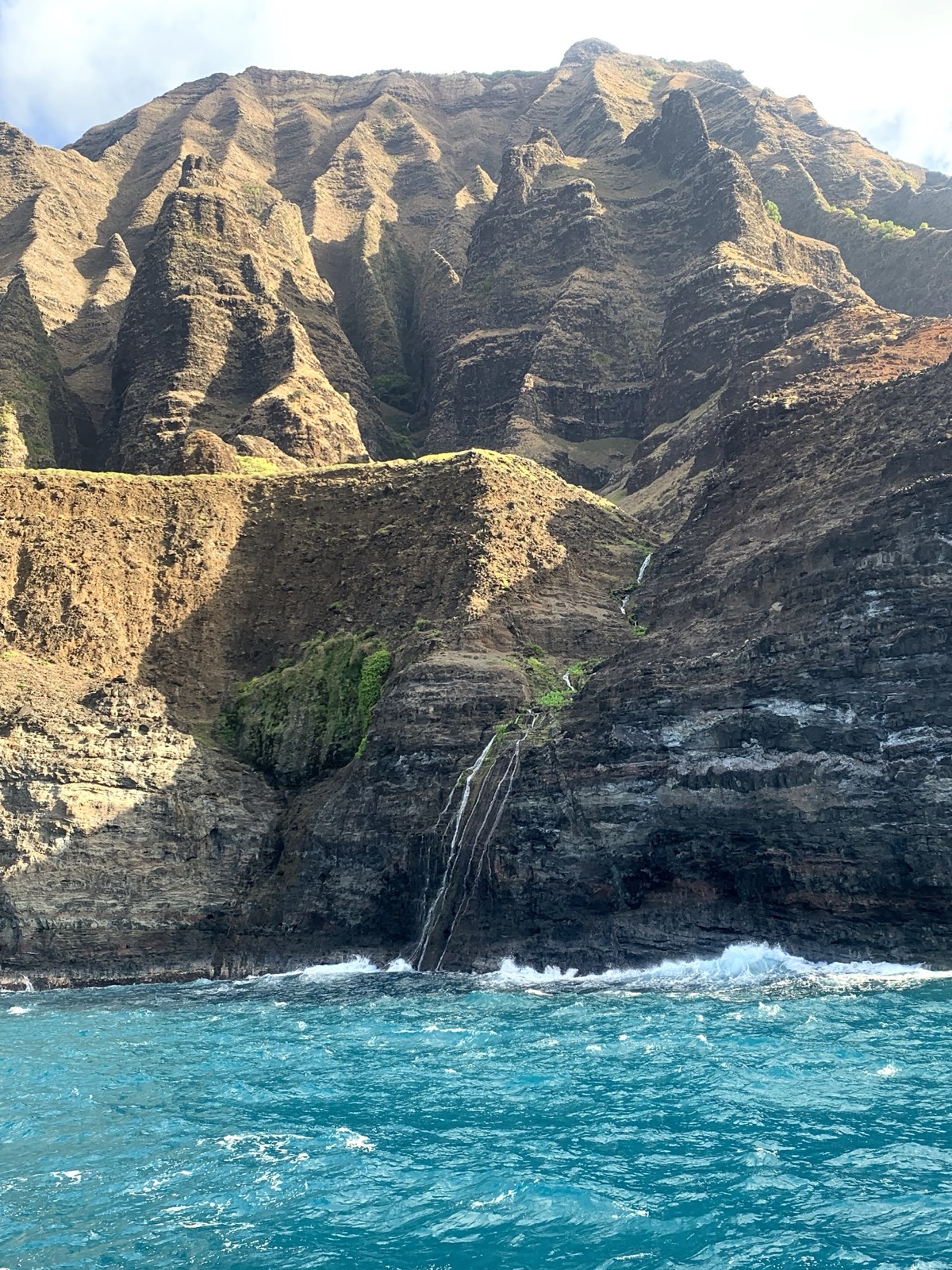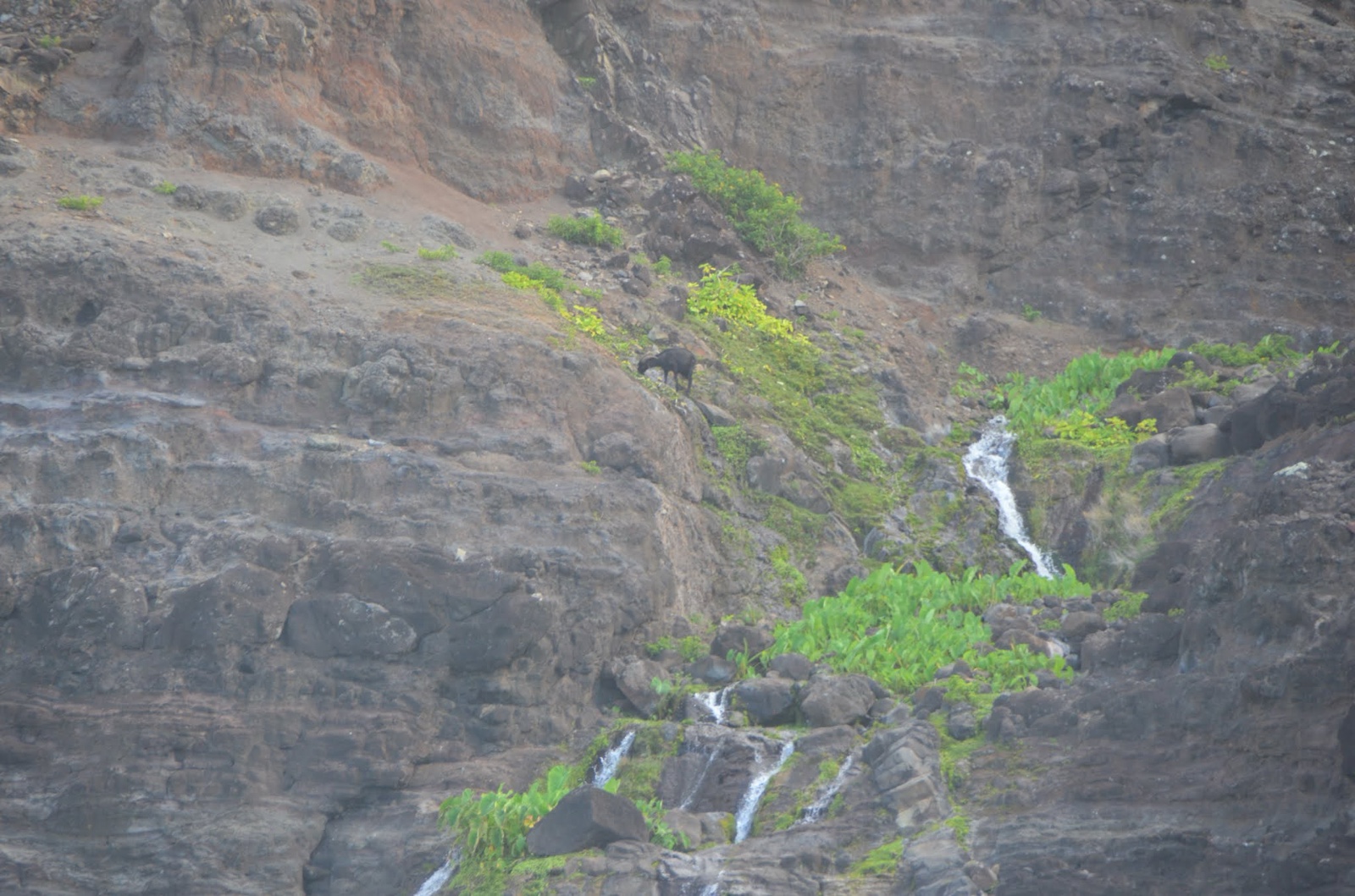 Eventually we left the dolphins behind and started up the Na Pali Coast. This section of Kaua'i has many steep cliffs. There are no roads on this side of the island, so people who go here either kayak or hike. (Or see it by helicopter, like Sharon & Roger did; or by boat, like we did).