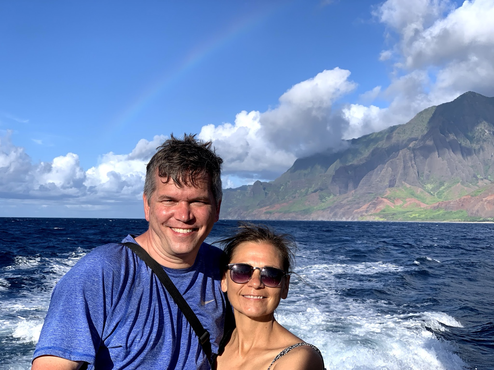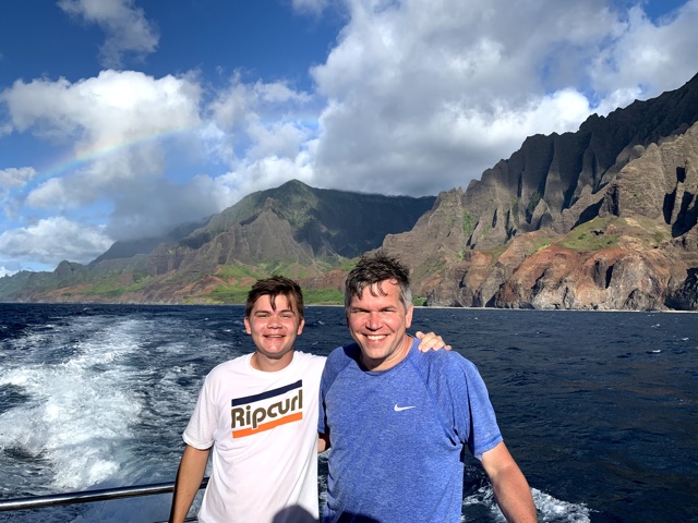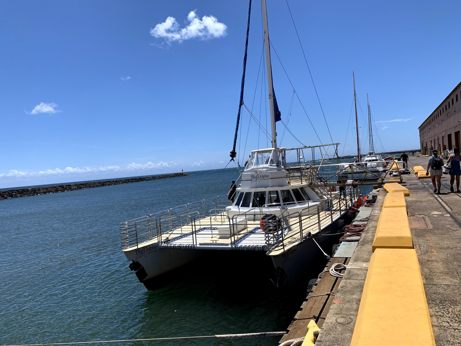 We drove down to Port Allen on the south shore and checked in at Blue Dolphin Charters for our 6-hour boat tour. Adam realized his mask was going to leak if he kept his mustache, so he had me shave that thing right off.
