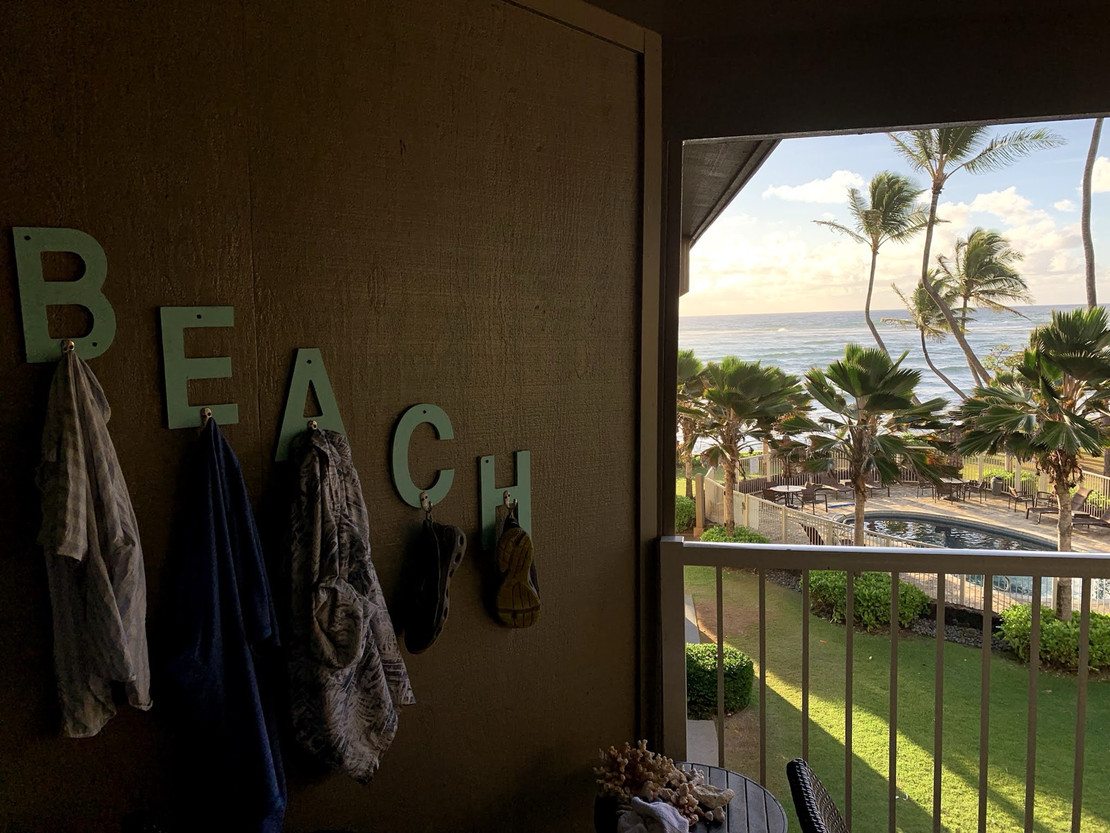 The condo didn't allow people to hang their towels and stuff on the railings (to keep the view looking nice for everyone), but ours had the letters "BEACH" on the wall, with a hook on each, which was handy.