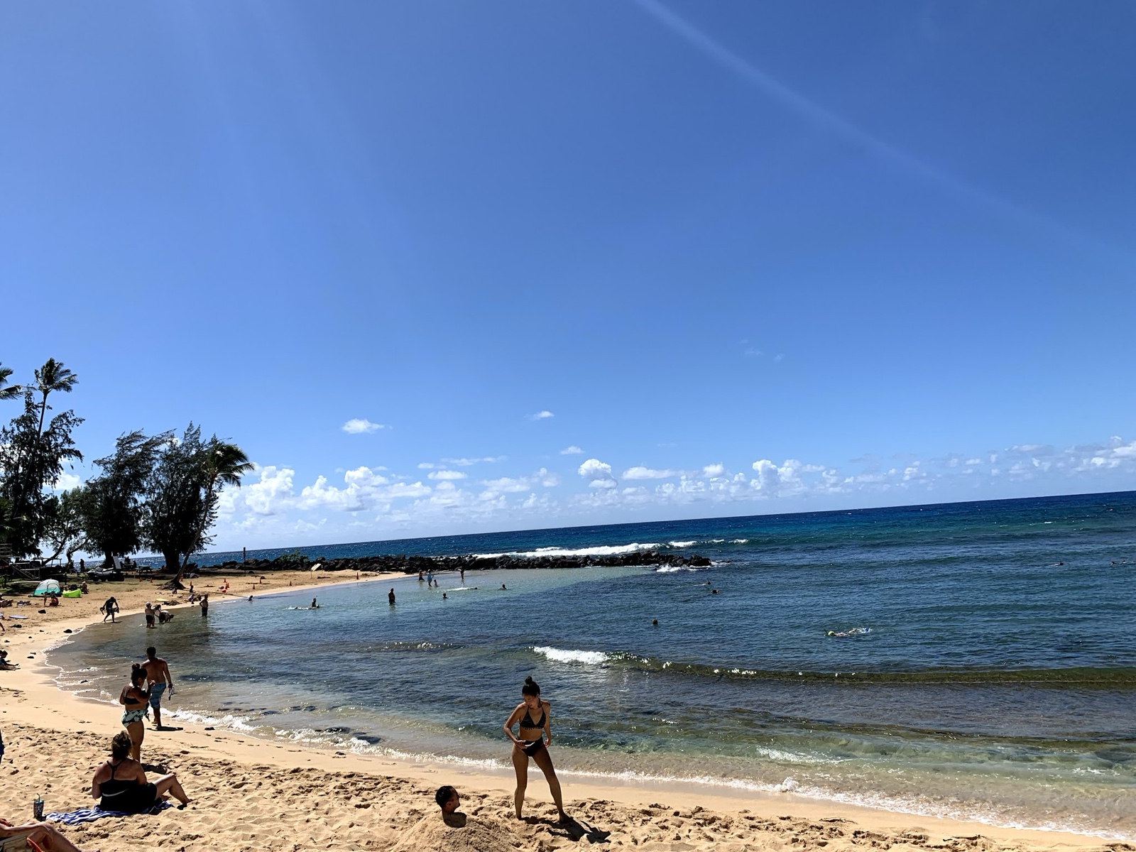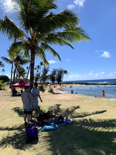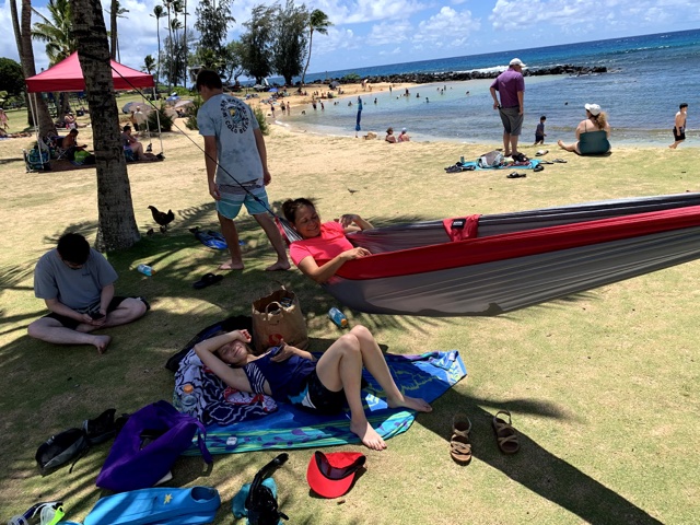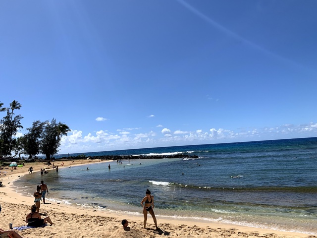 Poipu Beach had some good snorkeling. At first we made the mistake of heading straight out, which takes you over rocks and maybe some coral, which beats you up a little on the way out, and really bangs you up on the way in. Then we discovered a nice sandy area around the left side from which you can snorkel with no problem.