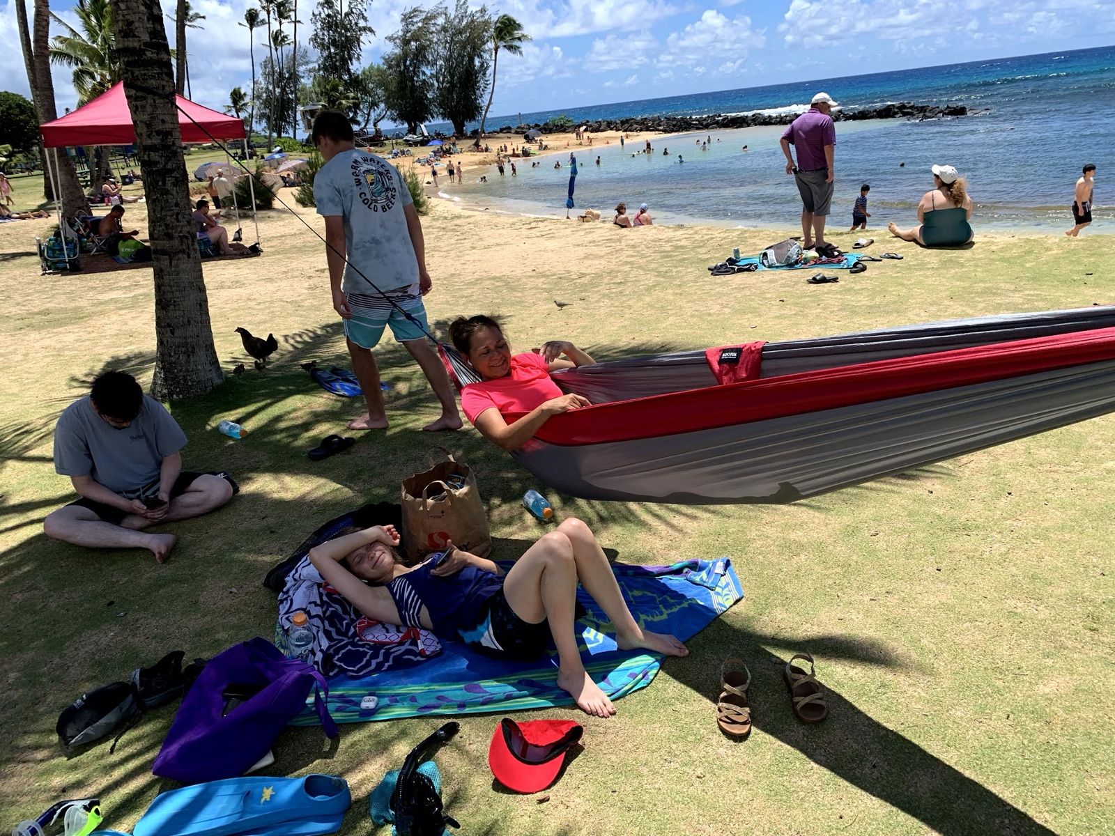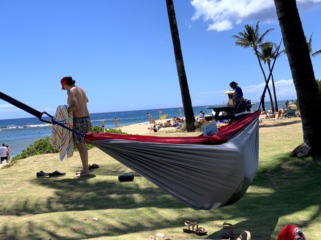 Another palm tree was close enough that we could set up a hammock that was still in the shade, so Linette hung out there and read her book for some time.